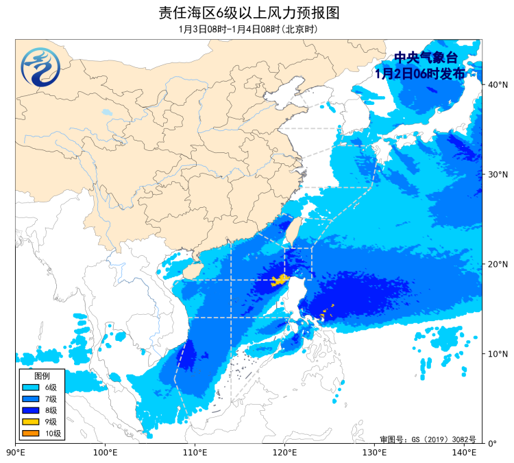 3日08時至4日08時,台灣海峽、台灣以東洋面、巴士海峽、南海大部海域將有7~8級、陣風9級的大風,其中南海東北部、巴士海峽部分海域風力可達9級、陣風10級。