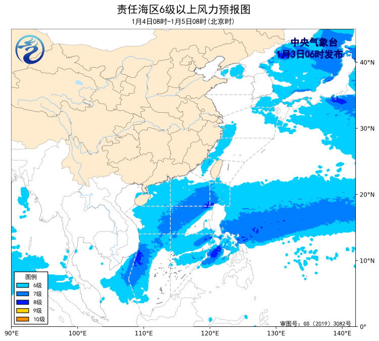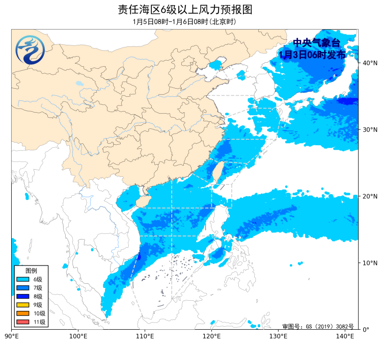 4日08時至5日08時,巴士海峽、南海東部、中西部和南海西南部海域將有5~7級、陣風8級的偏東到東北風,東海北部海域將有4級以下增大到5~6級、陣風7級的西北風,黃海北部海域、東海南部海域、台灣海峽、南海西北部海域將有4~6級、陣風7級的偏北到東北風。