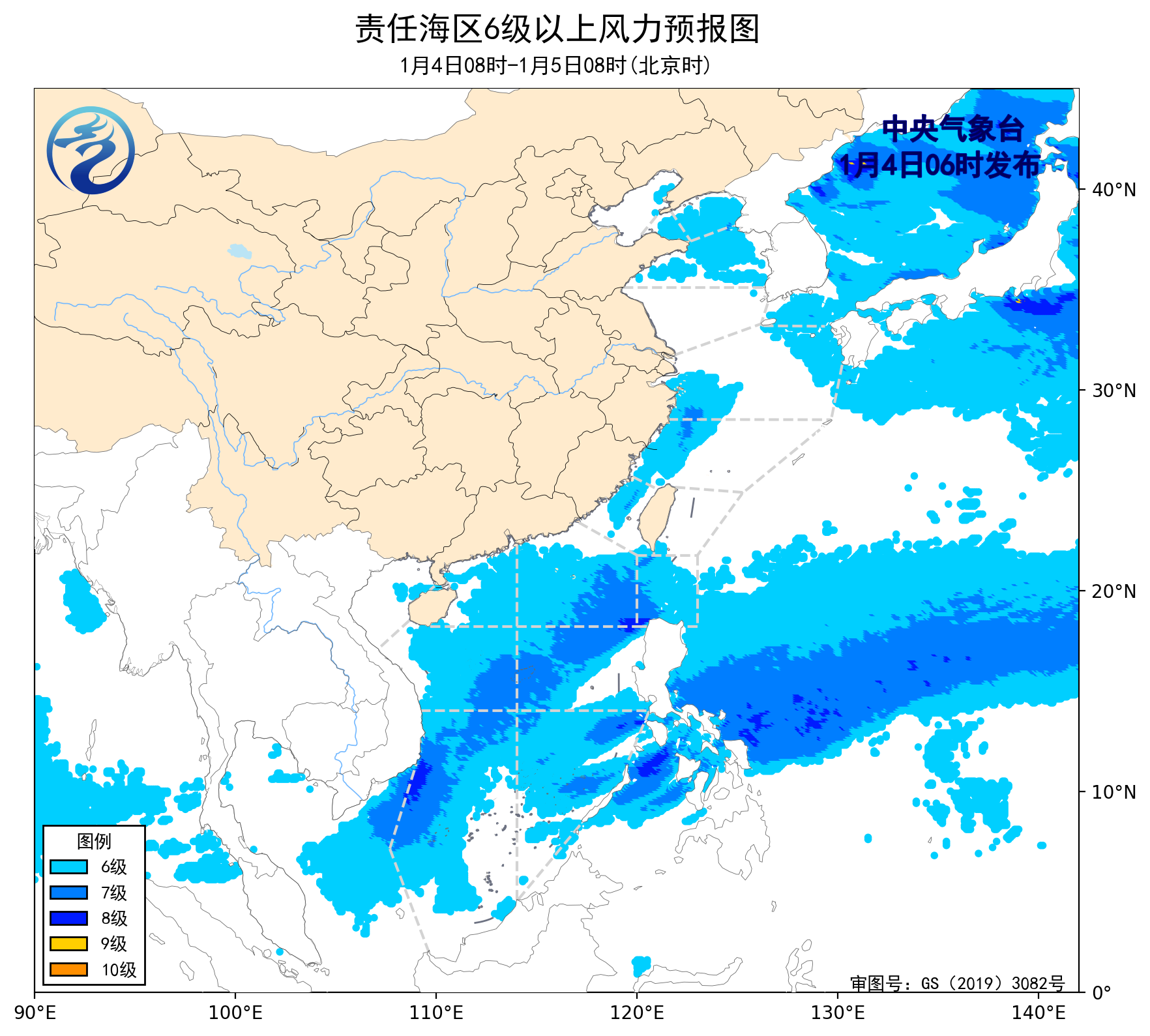 4日08時至5日08時,巴士海峽、南海東部、中西部和南海西南部海域將有5~7級、陣風8級的偏東到東北風,黃海中部海域、東海北部海域將有4級以下的偏北風增大到5~6級、陣風7級的西北風,渤海海峽、黃海北部海域、東海南部海域、台灣海峽、南海西北部海域將有4~6級、陣風7級的偏北到東北風,瓊州海峽將有4~6級、陣風7級的偏東到東北風。