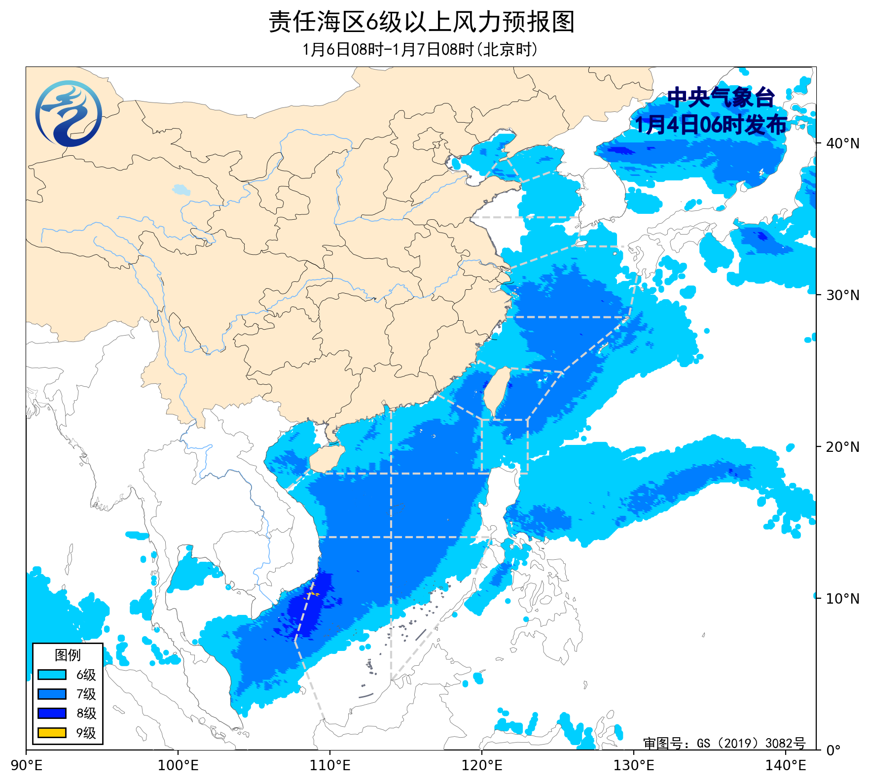 6日08時至7日08時,南海西南部海域將有6~8級、陣風9級的東北風,東海大部海域將有5~7級、陣風8級的偏北到西北風,台灣海峽、台灣以東洋面、巴士海峽、北部灣、南海東部和中西部海域將有5~7級、陣風8級的偏北到東北風,渤海、黃海北部海域將有5~6級、陣風7級的偏西轉偏北風,瓊州海峽、南海西北部海域將有5~6級、陣風7級的東北風,渤海海峽、黃海中部和南部海域將有4~6級、陣風7級的偏西到西北風。