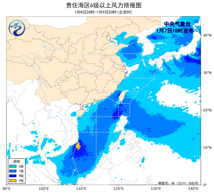 8日20時至9日20時,巴士海峽、南海東北部海域將有6~8級、陣風9級的偏北到東北風,黃海北部和中部海域將有5~7級、陣風8級的西南風,黃海南部海域將有4~5級增大到6~7級、陣風8級的西南風,台灣海峽、台灣以東洋面、南海中東部和東南部海域將有5~7級、陣風8級的偏北到東北風,渤海、渤海海峽將有5~6級、陣風7級的西南風,東海北部海域將有4~6級、陣風7級的偏北轉西南風,東海南部海域、北部灣、南海西北部和中西部海域將有4~6級、陣風7級的偏北到東北風。