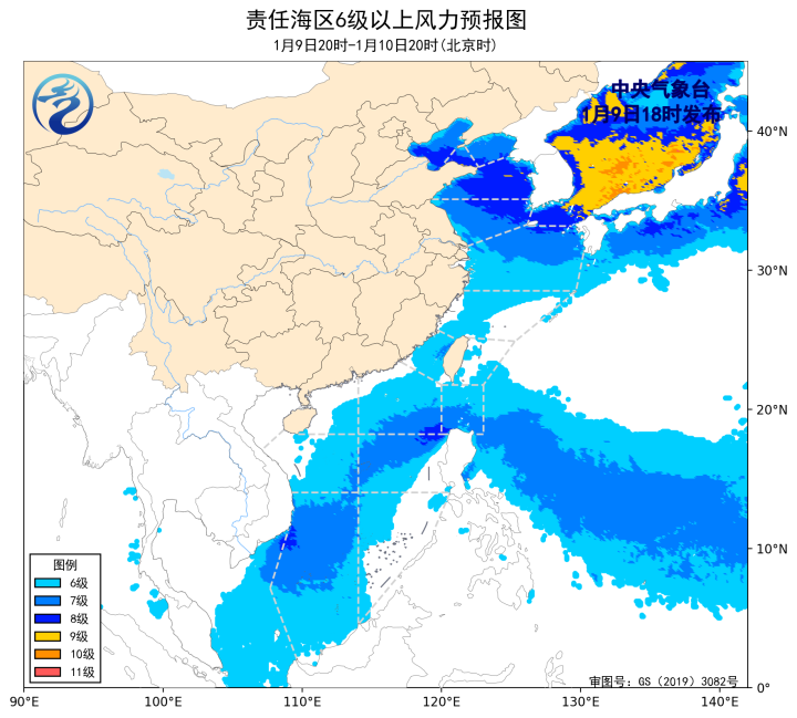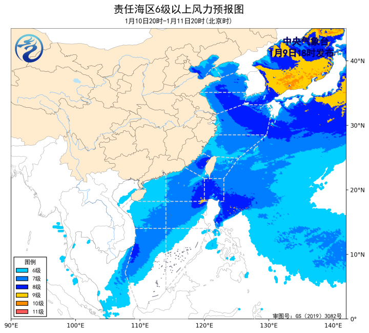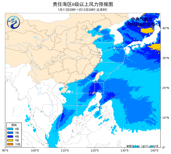 10日20時至11日20時,渤海、黃海大部海域、東海大部海域、台灣海峽、台灣以東洋面、巴士海峽、南海大部海域將有6~8級、陣風9級的大風,其中南海東北部、巴士海峽的部分海域風力可達9級、陣風10級。