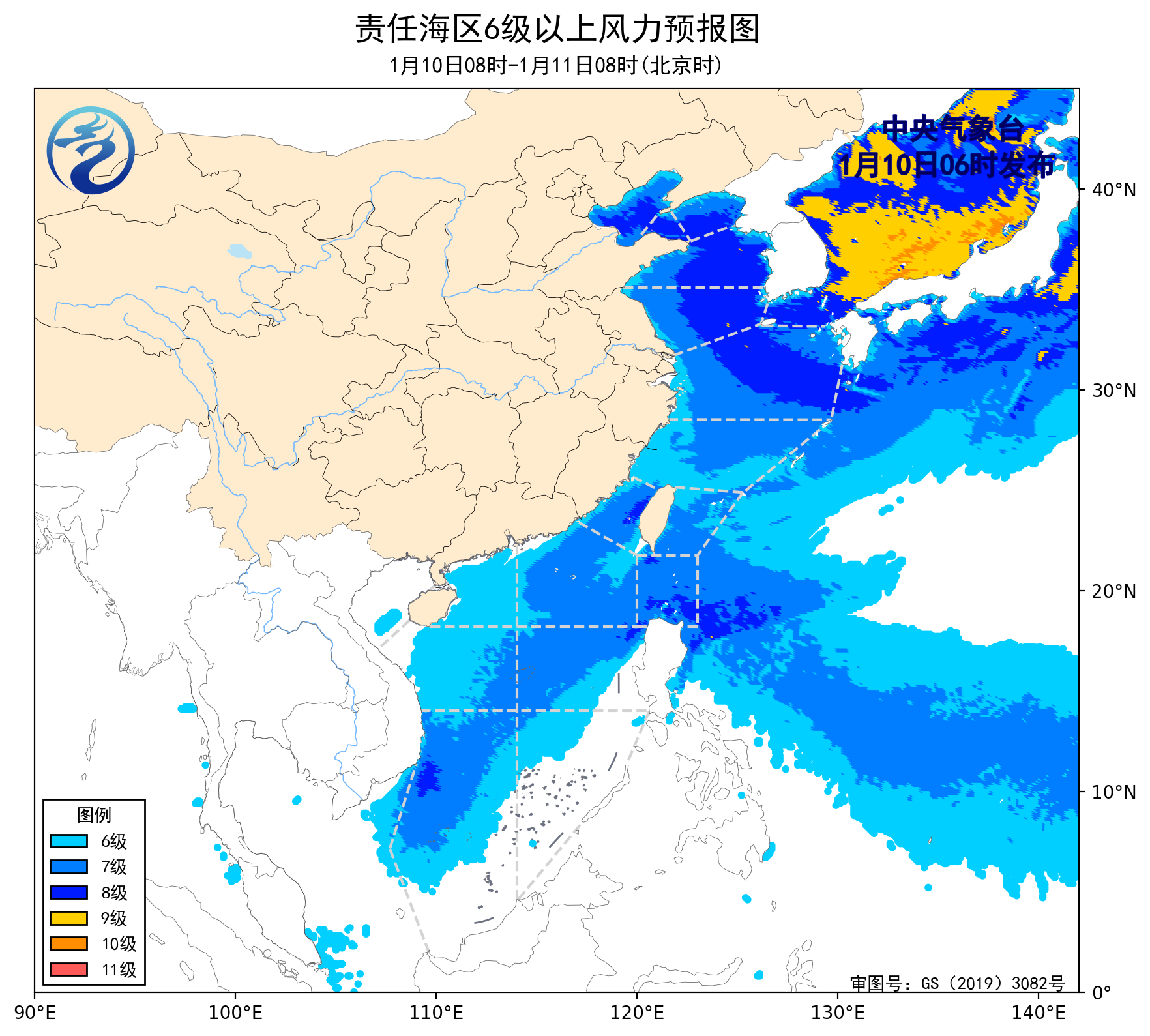 10日08時至11日08時,渤海、渤海海峽、黃海大部海域、東海大部海域、台灣海峽、台灣以東洋面、巴士海峽、南海東北部和中部海域、南海西南部海域將有7~8級、陣風9~10級的大風,南海西北部和南海東南部海域將有4~6級、陣風7級的東北風。