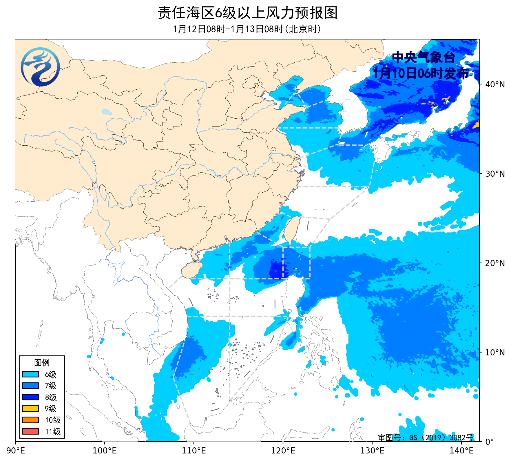 1月9日14時至10日02時,渤海、渤海海峽、黃海大部海域出現了7~8級、陣風9~10級的西北風,東海北部海域出現了5~6級、陣風7級的偏西風,台灣海峽、巴士海峽、南海東北部和中西部海域、南海南部海域出現了5~7級、陣風8級的東北風或偏北風。