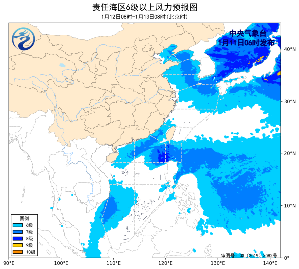 1月10日14時至11日02時,渤海、巴士海峽出現了6~8級、陣風9級的偏北風或東北風,黃海大部海域、東海大部海域、台灣海峽、台灣以東洋面、南海東北部海域、南海中西部和南部海域出現了5~7級、陣風8級的偏北風或西北風。