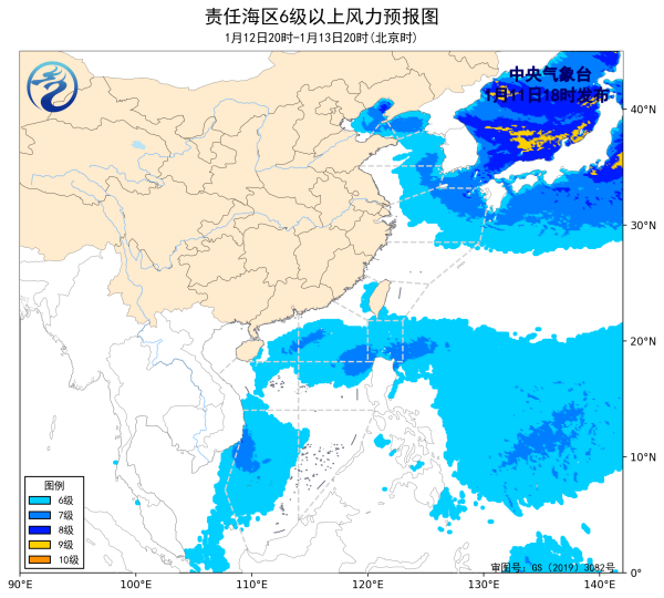 1月11日02時至14時,渤海、黃海中部和南部海域、東海北部海域出現了6~8級、陣風9級的偏西風或西北風,黃海北部海域出現了5~6級、陣風7級的西北風,東海南部海域、台灣海峽、台灣以東洋面、巴士海峽、南海北部海域、南海中西部和南部海域出現了5~7級、陣風8級的東北風或偏北風。