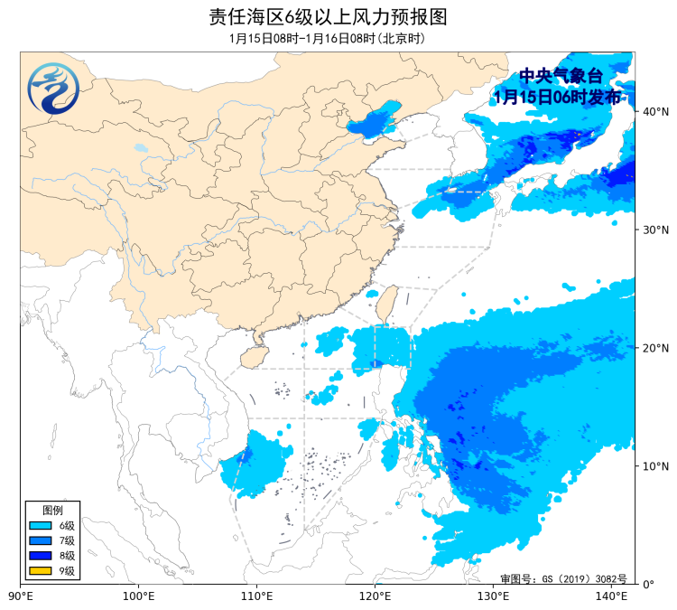 1月14日14時至15日02時,黃海北部海域、巴士海峽、南海東北部海域出現了5~7級、陣風8級的偏東風或東南風,黃海南部海域、東海北部海域出現了5~6級、陣風7級的偏南風或西南風。渤海、黃海北部海域出現了能見度不足1公里的大霧。