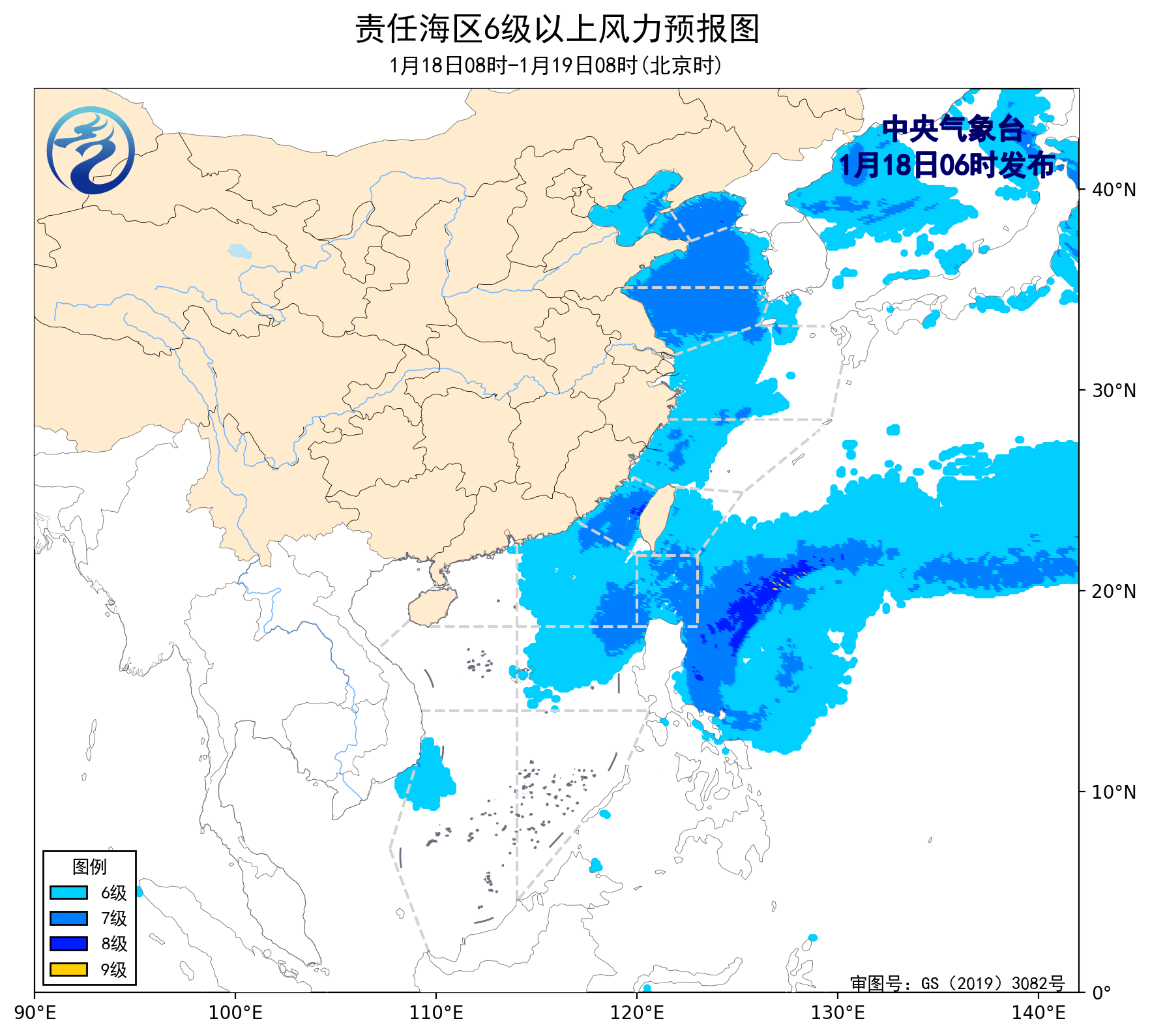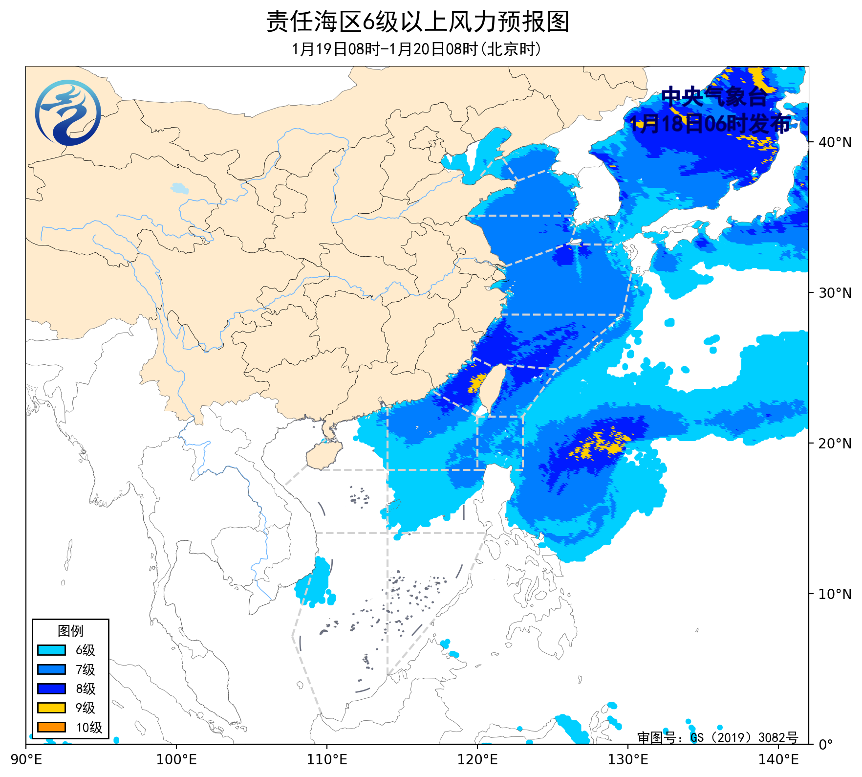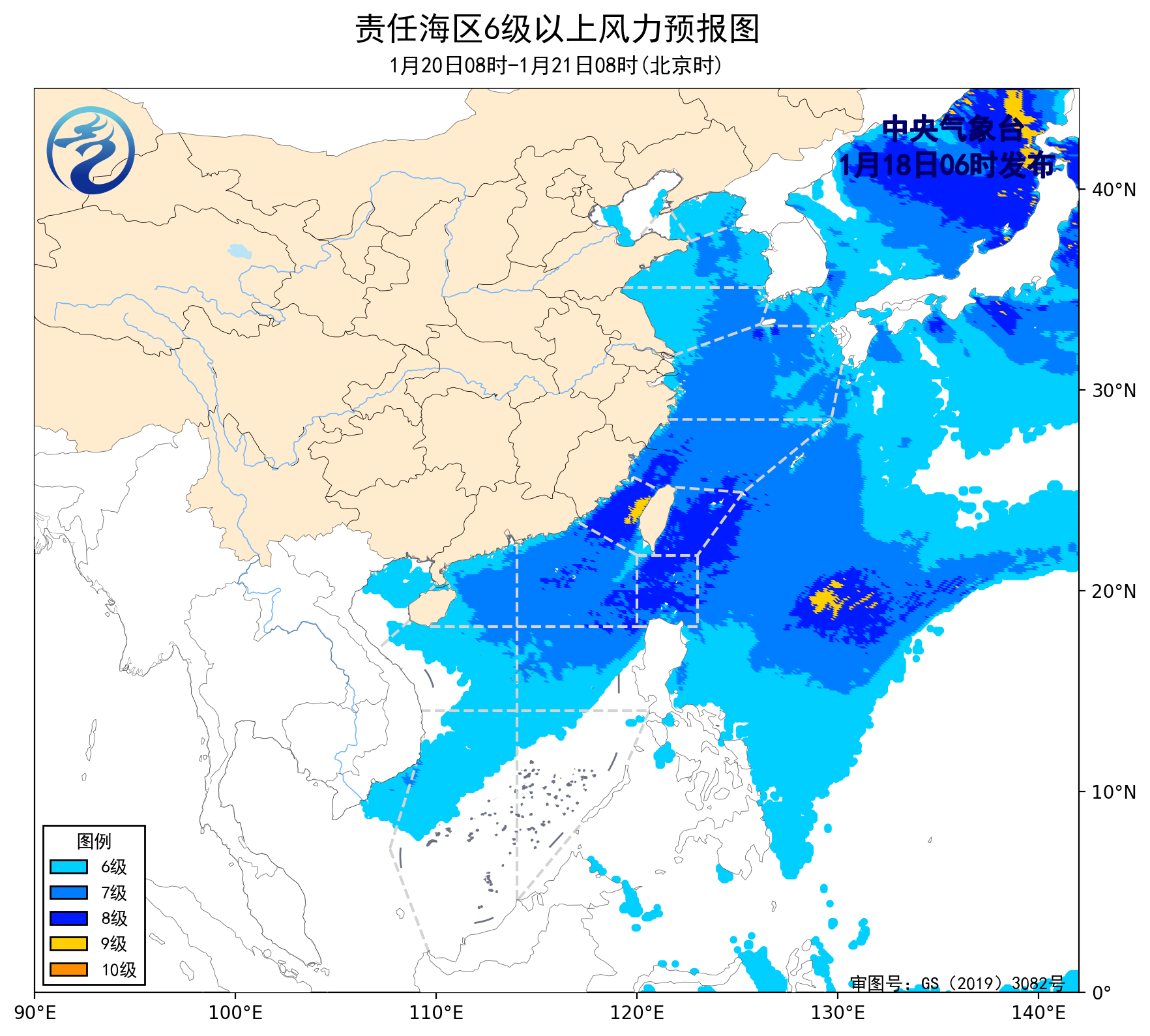 19日08時至20日08時,東海南部海域、台灣海峽將有6~8級、陣風9級的東北風,台灣以東洋面將有5~6級、陣風7級的東北風增大到7~8級、陣風9級的偏北風,渤海海峽、黃海大部海域、東海北部海域、巴士海峽、南海東北部海域將有5~7級、陣風8級的偏北到東北風,渤海、南海中東部海域將有5~6級、陣風7級的偏北到東北風,南海西北部海域將有4~6級、陣風7級的偏東風。