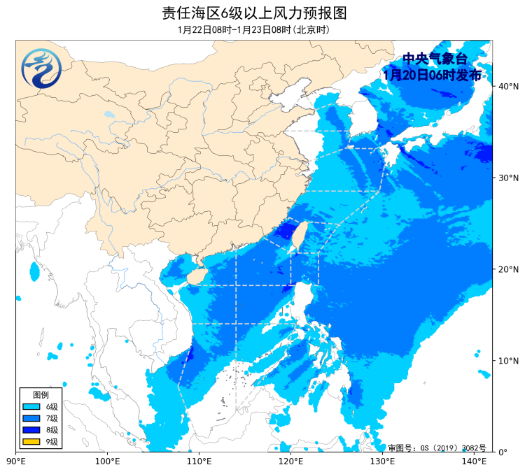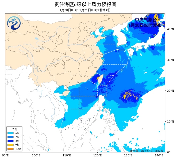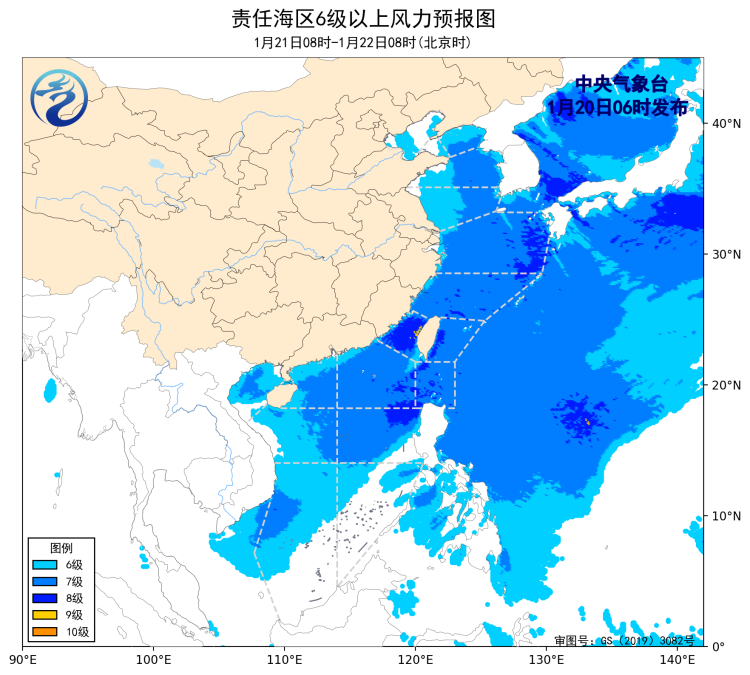 20日08時至21日08時,黃海大部海域、東海大部海域、台灣海峽、台灣以東洋面、巴士海峽、南海北部和中東部海域將有7~8級、陣風9級的大風,其中台灣海峽部分海域風力可達9級、陣風10級。