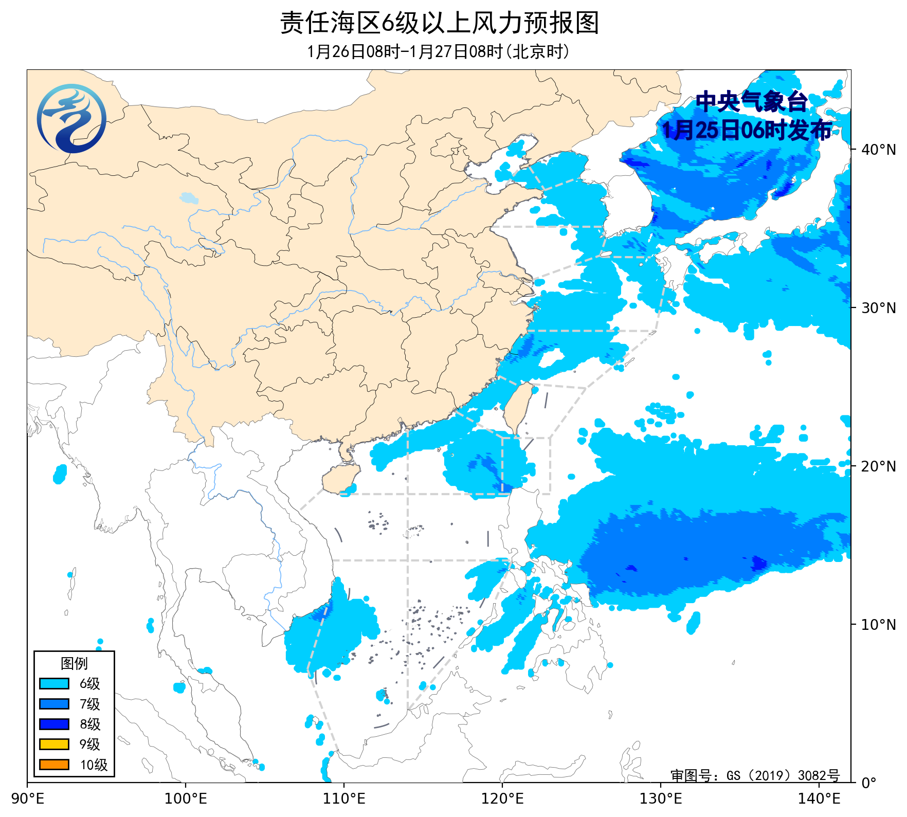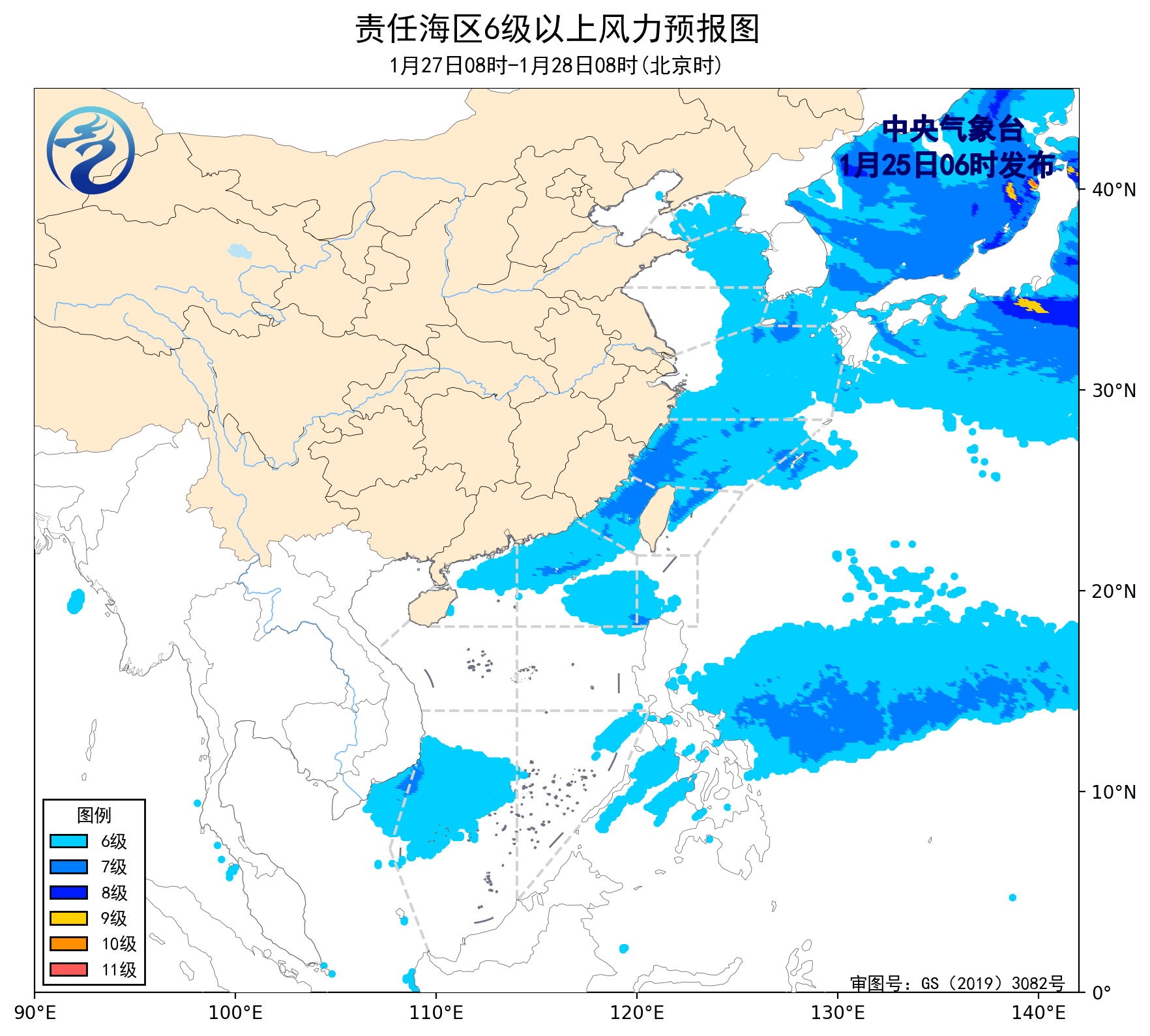 1月24日14時至25日02時,東海大部海域、台灣海峽、南海西南部海域出現了5~6級、陣風7級的東北風或偏北風,巴士海峽、南海東北部海域出現了5~6級、陣風7級的偏東風。