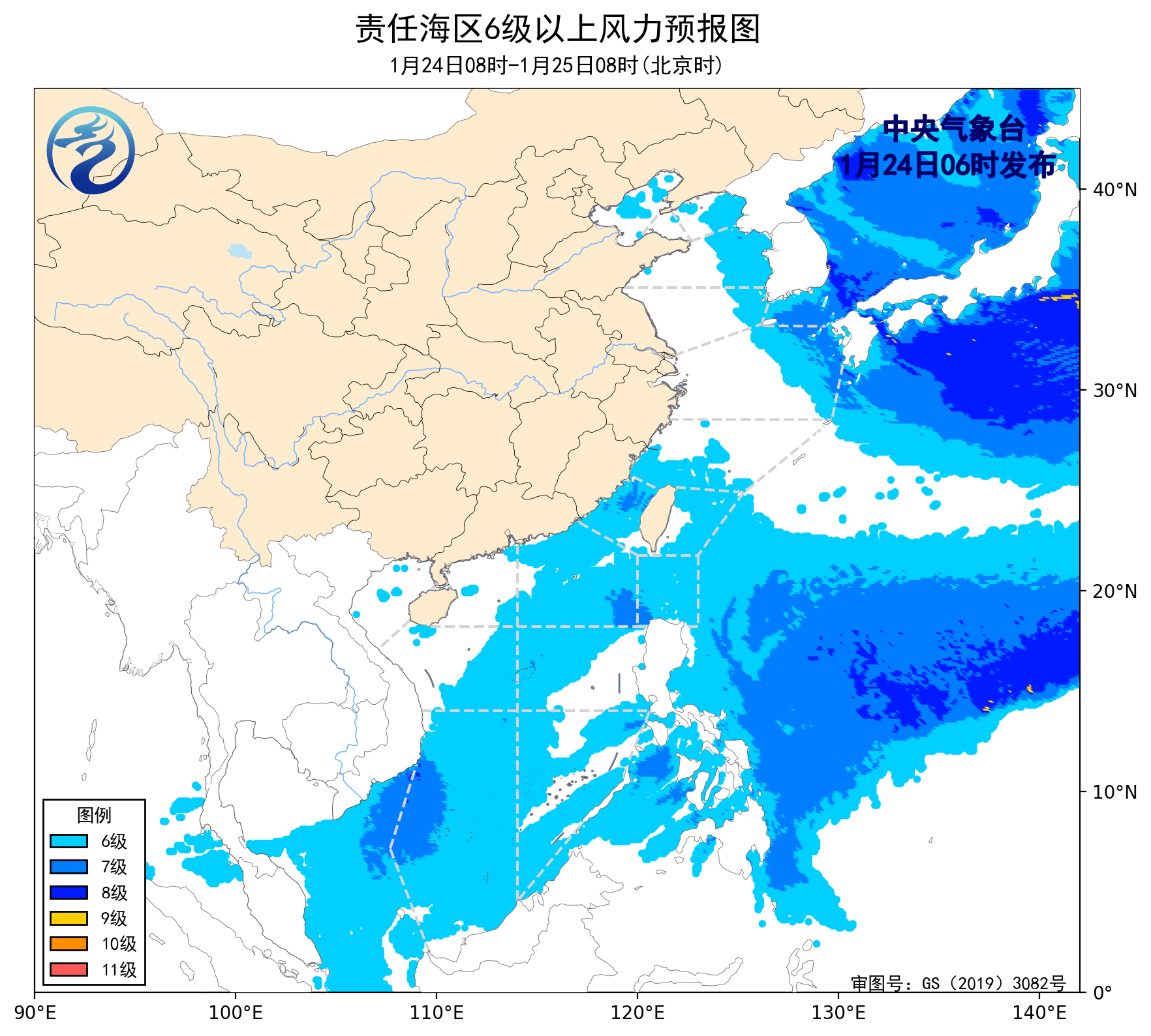 24日08時至25日08時,東海北部海域將有5~7級、陣風8級的西北風,南海西南部海域將有6~7級、陣風8級的東北風,黃海大部海域將有4~6級、陣風7級的偏北到西北風,台灣海峽、南海中部和東南部海域將有5~6級、陣風7級的偏北到東北風,東海南部海域、台灣以東洋面、巴士海峽、南海東北部海域將有5~6級、陣風7級的偏東到東北風。