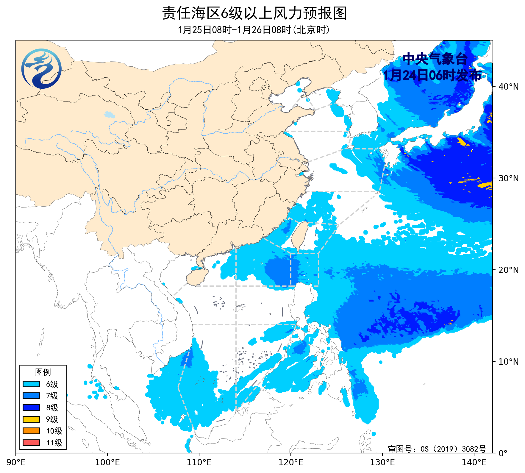 1月23日14時至24日02時,黃海中部海域、東海北部海域、台灣海峽出現了5~6級、陣風7級的偏北風或西北風,巴士海峽、南海東北部海域、南海中西部和南部海域出現了5~7級、陣風8級的東北風或偏東風。