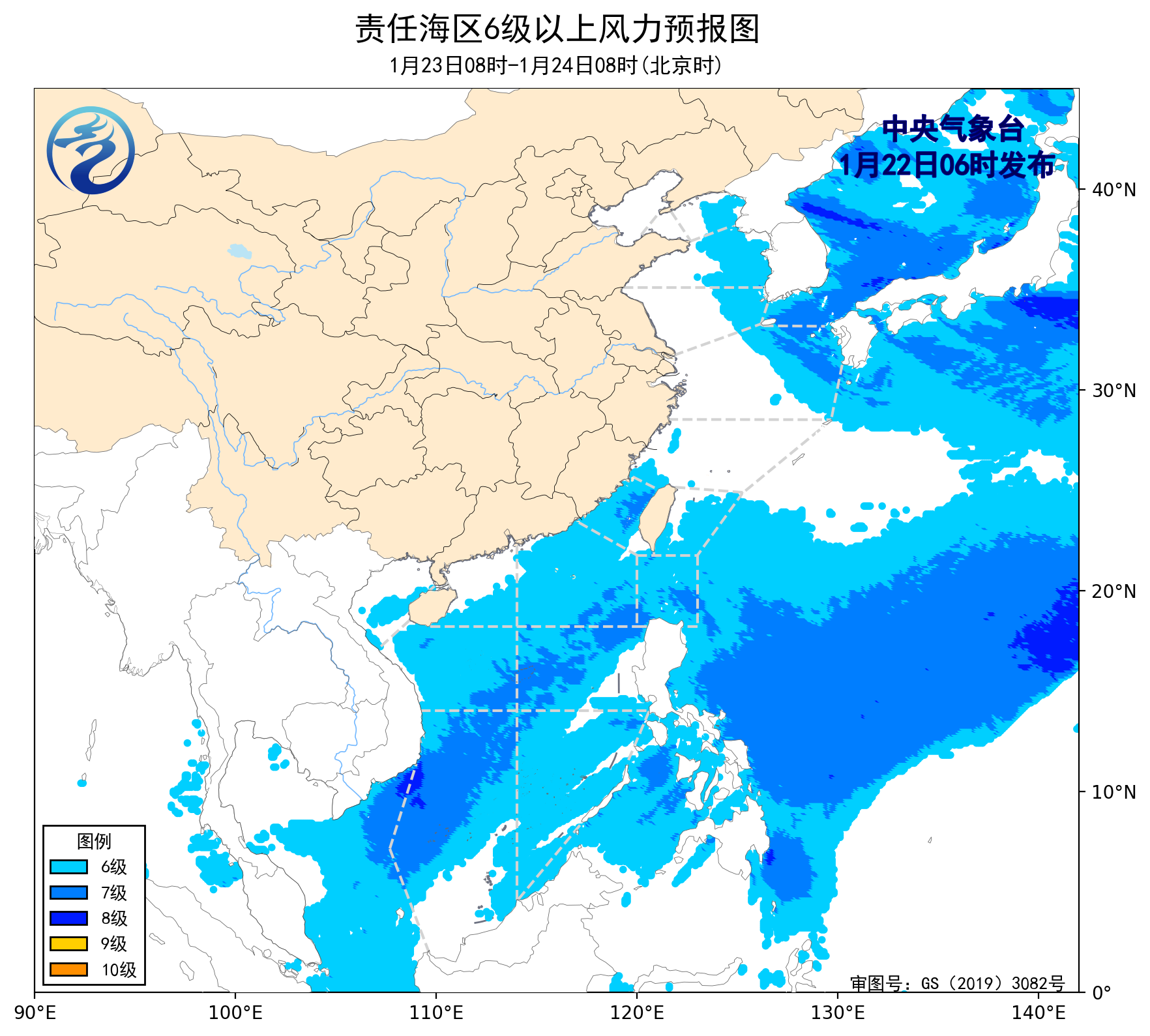 23日08時至24日08時,東海北部海域將有4~5級增大到6~7級、陣風8級的西北風,台灣海峽、南海東北部、中東部和南海西南部海域將有5~7級、陣風8級的偏北到東北風,巴士海峽將有5~7級、陣風8級的偏東風,黃海大部海域將有4~6級、陣風7級的偏西到西北風,台灣以東洋面、北部灣、南海西北部、中西部和南海東南部海域將有4~6級、陣風7級的偏東到東北風。