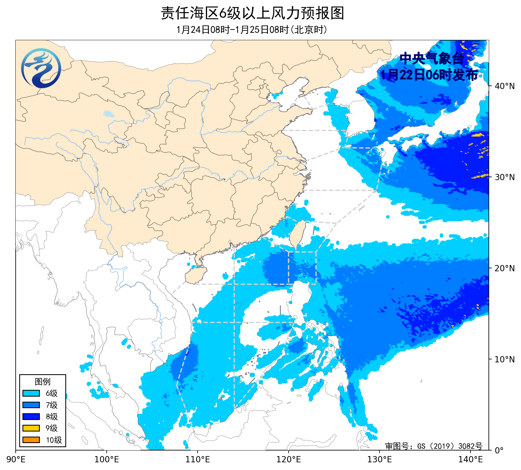 24日08時至25日08時,巴士海峽、南海東北部海域將有6~7級、陣風8級的偏東到東北風,黃海中部海域、東海北部海域將有5~6級、陣風7級的西北風,台灣海峽將有5~6級、陣風7級的偏北轉偏東風,台灣以東洋面、南海中部和東南部海域將有4~6級、陣風7級的偏東到東北風。