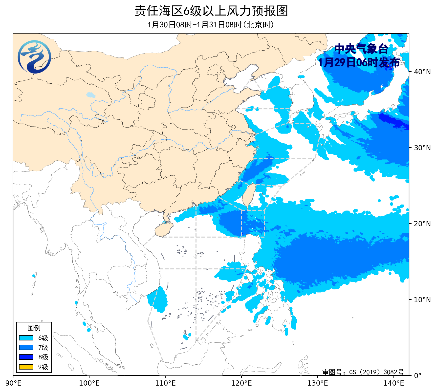 1月28日14時至29日02時,黃海南部海域、東海大部海域、台灣海峽、台灣以東洋面、巴士海峽、南海西南部海域出現了5~7級、陣風8級的東北風或偏北風,南海東北部海域出現了6~7級、陣風8級的偏東風。