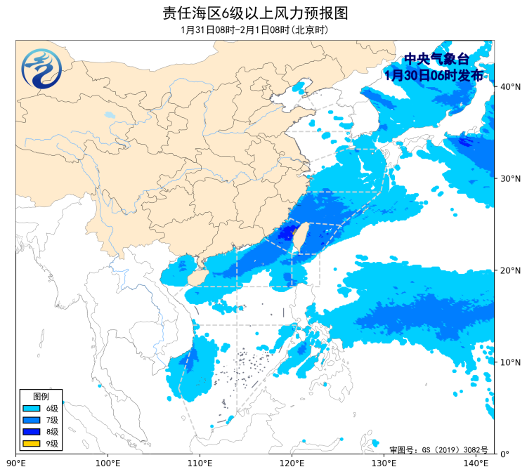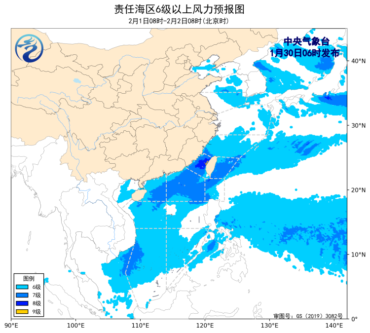 1月31日08時至2月1日08時,台灣海峽將有6~8級、陣風9級的東北風,東海南部海域、台灣以東洋面、南海北部海域將有5~7級、陣風8級的偏北到東北風,巴士海峽將有5~7級、陣風8級的偏東到東北風,東海北部海域、北部灣、南海中西部和西南部海域將有4~6級、陣風7級的偏北到東北風。