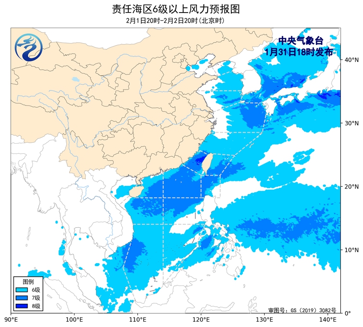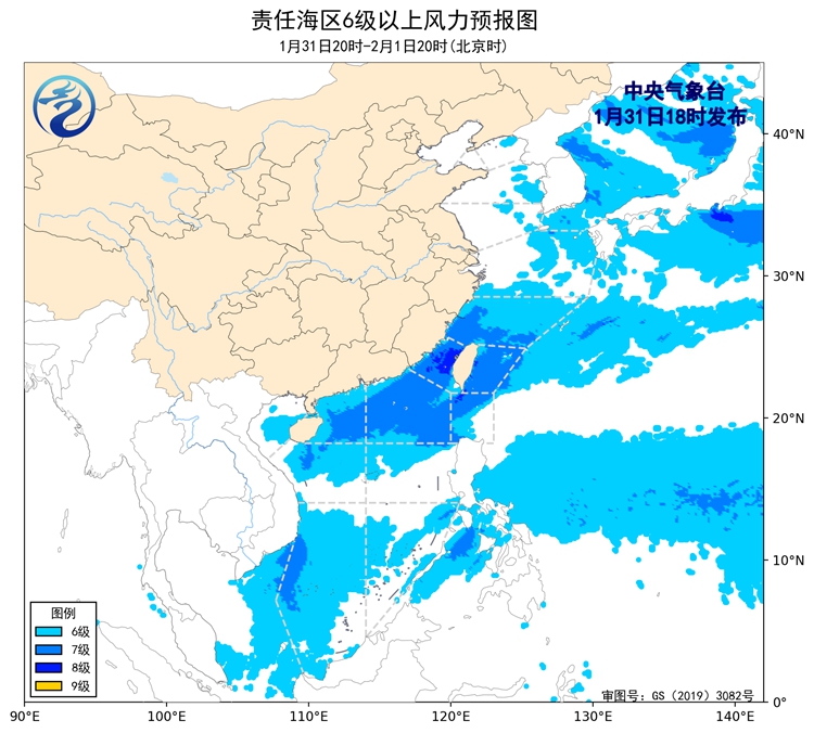 1月31日20時至2月1日20時,台灣海峽將有7~8級、陣風9級的東北風,東海南部海域、台灣以東洋面、巴士海峽、南海北部海域將有5~7級、陣風8級的東北風,東海北部海域將有4~6級、陣風7級的西北風,北部灣、南海南部和中部海域將有4~6級、陣風7級的東北風。