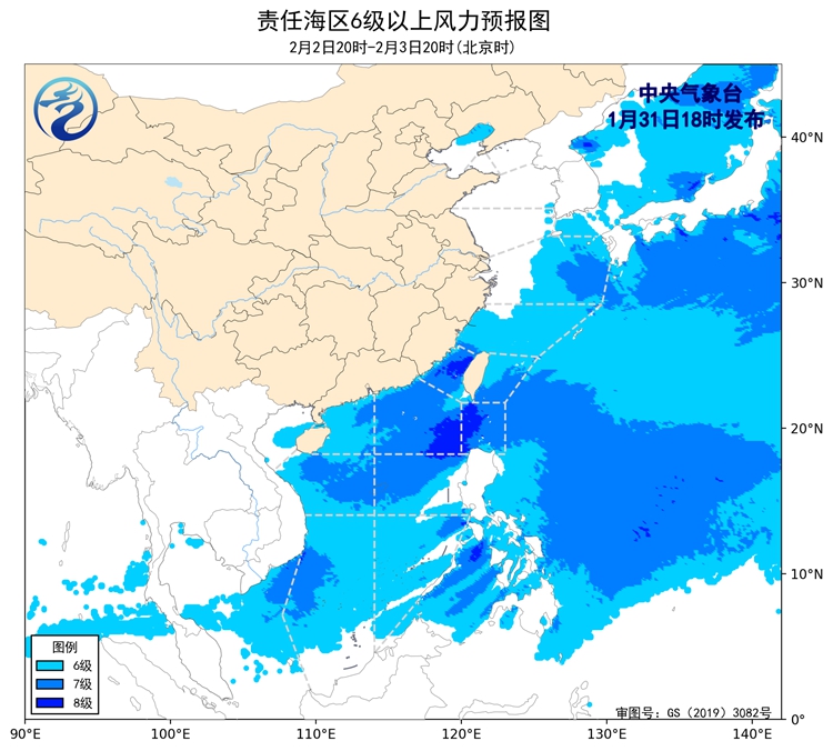 預計,2月3日夜間至2月7日夜間,渤海、南海大部海域將有6~8級、陣風9級的大風,渤海海峽、黃海大部海域、北部灣將有6~7級、陣風8級的風,東海大部海域將有6~7級、陣風8級增大至8~9級、陣風10級的大風,台灣海峽、台灣以東洋面、巴士海峽將有7~8級、陣風9級的大風,瓊州海峽將有5~6級、陣風7級的風。