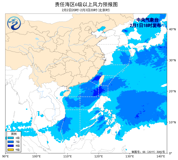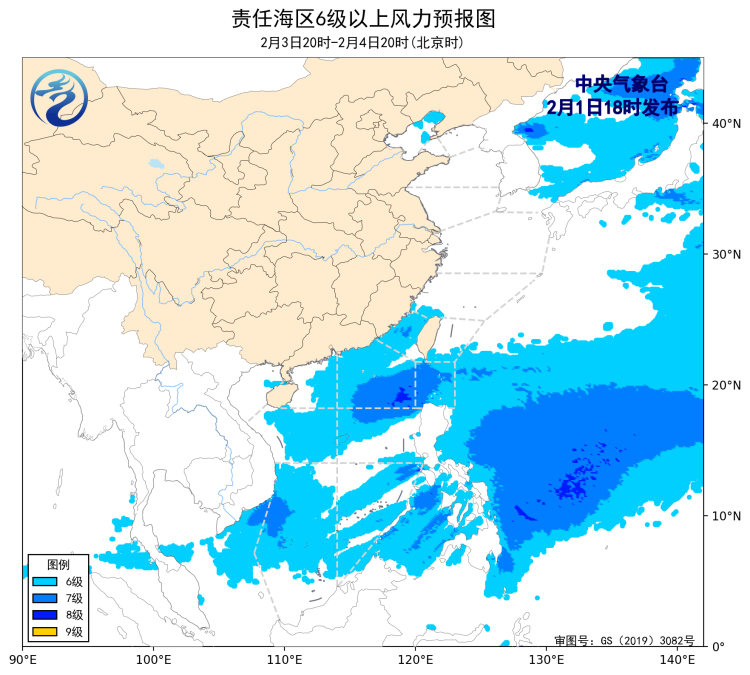 預計, 2月4日夜間至8日白天,渤海、渤海海峽、黃海大部海域、東海大部海域、台灣海峽、台灣以東洋面、巴士海峽、南海大部海域、北部灣將有6~7級、陣風8級的風。其中5日夜間至6日白天,東海東部海域風力可達8~9級、陣風10~11級;6日夜間至7日白天,黃海大部海域、巴士海峽、南海東北部海域風力可達8級、陣風9級,東海大部海域、台灣海峽、台灣以東洋面風力可達8~9級、陣風10~11級;7日夜間至8日白天,黃海大部海域風力可達8級、陣風9級,東海東北部海域、台灣海峽、巴士海峽、南海東北部和中東部海域風力可達8~9級、陣風10~11級。