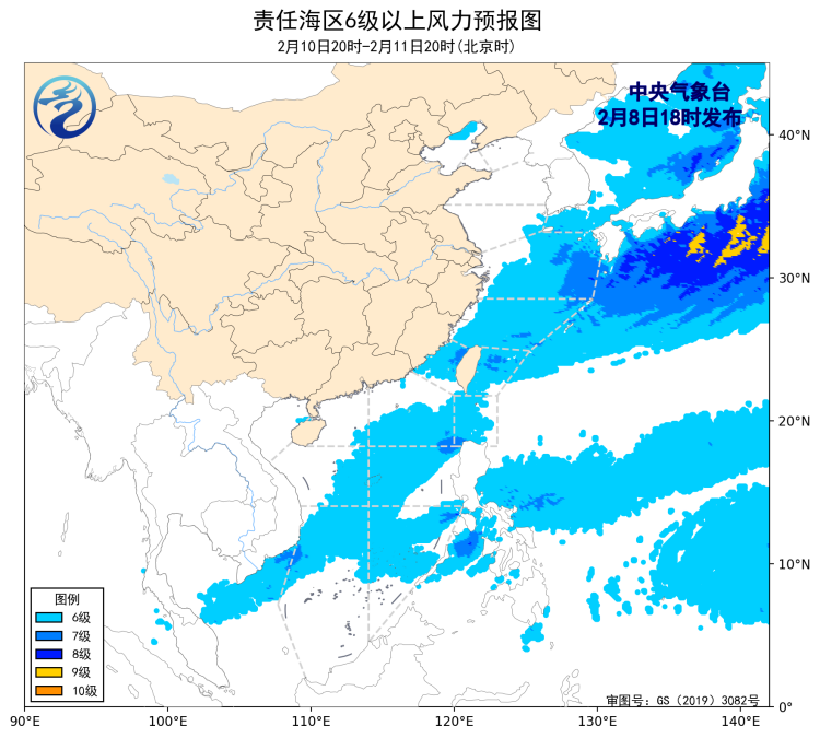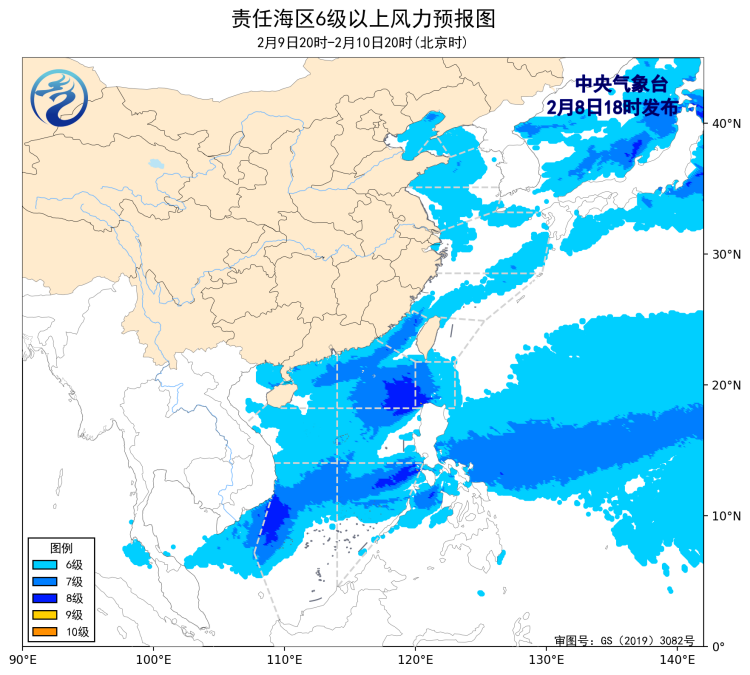 9日20時至10日20時,巴士海峽、南海東部和西南部海域將有5~7級、陣風8級的偏東到東北風,台灣海峽將有5~6級、陣風7級減弱到4級以下的偏北風,渤海、渤海海峽、黃海大部海域、東海大部海域將有4~6級、陣風7級的偏南到西南風,北部灣、瓊州海峽將有4~6級、陣風7級的偏東到東南風,南海西北部和中西部海域將有5~6級、陣風7級的偏東到東北風。