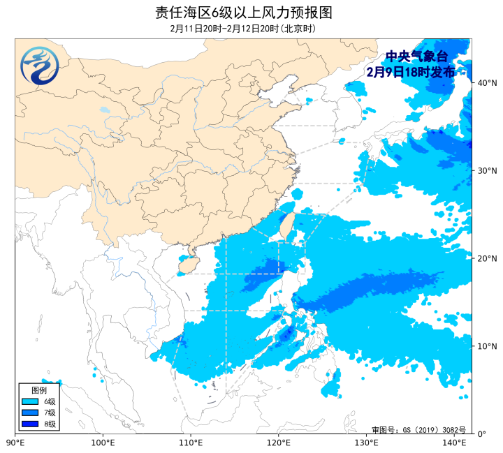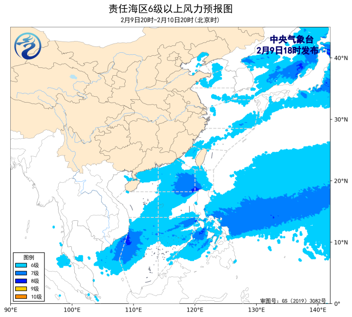 2月9日02時至14時,渤海出現了5~6級、陣風7級的西南風,東海南部海域、台灣海峽、台灣以東洋面、南海中西部和南部海域出現了5~7級、陣風8級的東北風或偏北風,巴士海峽、南海東北部海域出現了7~8級、陣風9級的偏東風,南海西北部海域、北部灣出現了5~6級、陣風7級的偏東風。