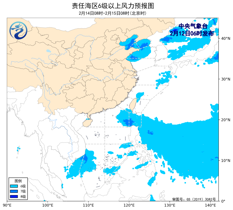 2月11日14時至12日02時,東海大部海域、台灣海峽、台灣以東洋面、南海東北部海域、南海西南部海域出現了5~6級、陣風7級的東北風或偏北風,巴士海峽出現了5~6級、陣風7級的偏東風。