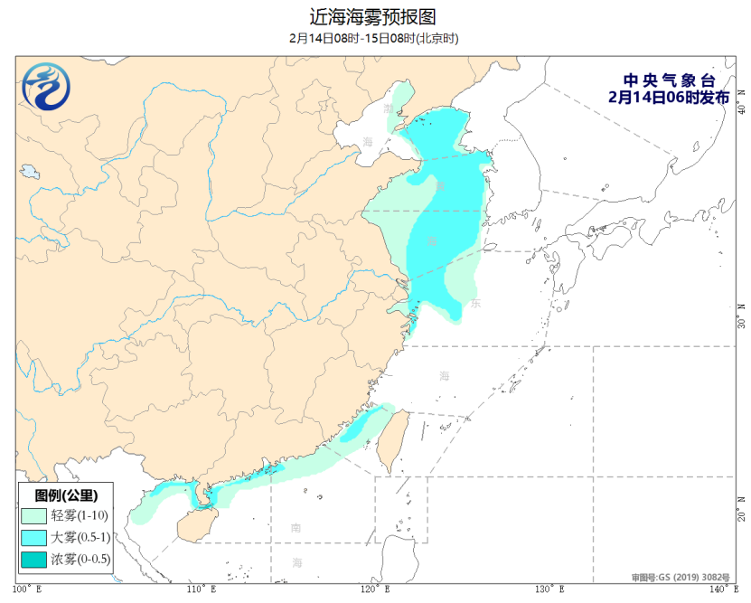 2月14日08時至20時,黃海大部、東海西北部、遼東半島東部沿海、長江口附近海域、大連港、成山頭、上海港有能見度不足1公里的大霧,部分時段能見度不足500米的濃霧。2月14日20時至15日08時,北部灣北部海域、瓊州海峽、雷州半島附近海域、廣東沿海海域、台灣海峽有能見度不足1公里的大霧,部分時段能見度不足500米的濃霧。