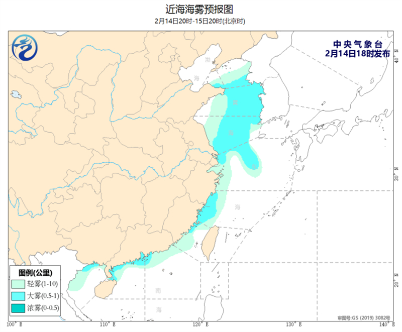 14日20時至15日20時,渤海、黃海中部海域將有5~7級、陣風8級的東北風到偏北風,巴士海峽將有5~6級、陣風7級的東南風到偏東風,東海北部海域將有4~6級、陣風7級的西北風到偏北風,渤海海峽、黃海北部和南部海域、南海西南部海域將有5~6級、陣風7級的偏北到東北風,南海東北部海域將有5~6級、陣風7級的偏東風。此外,2月14日夜間至15日早晨,黃海中部和南部、東海西北部和西南部、長江口附近海域、成山頭、上海港、浙閩交界沿岸海域、北部灣北部海域、瓊州海峽、雷州半島東部附近海域、廣東中西部沿海海域將有能見度不足1公里的大霧。