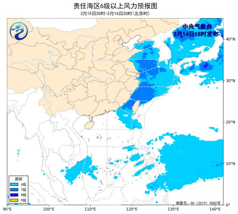 2月14日02時至14時,東海大部海域出現了5~6級、陣風7級的偏南風,巴士海峽、南海東北部海域、南海西南部海域出現了5~6級、陣風7級的東北風或偏東風。