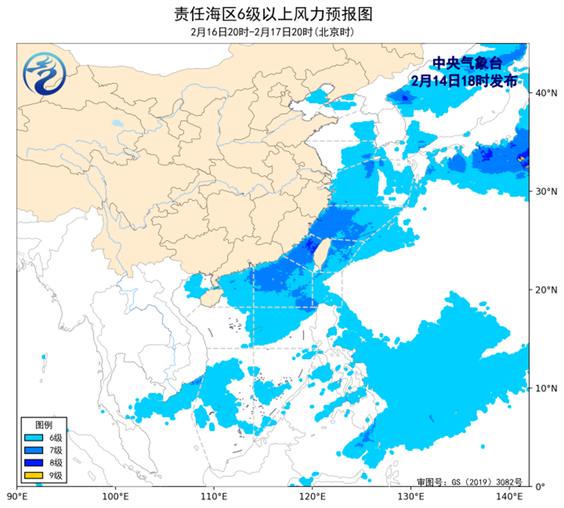 預計,2月17日夜間至2月23日夜間,渤海、渤海海峽、北部灣、瓊州海峽將有5~6級、陣風7級的風,黃海大部海域、台灣以東洋面將有6~7級、陣風8級的風,東海大部海域、南海大部海域將有6~8級、陣風9級的大風,台灣海峽、巴士海峽將有7~8級、陣風9級的大風。