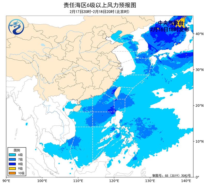 16日20時至17日20時,巴士海峽將有5~6級、陣風7級增大到7~8級、陣風9級的東北風,東海南部海域、台灣海峽、台灣以東洋面、南海東北部海域將有7~8級、陣風9級的偏北到東北風,渤海海峽將有4~5級增大到6~7級、陣風8級的偏西風,東海北部海域將有6~7級、陣風8級的偏北風,渤海、黃海北部海域將有5~6級、陣風7級的偏西風,黃海中部海域將有5~6級、陣風7級的偏北轉偏西風,瓊州海峽將有4級以下增大到5~6級、陣風7級的東北風,黃海南部海域、北部灣、南海西北部、中東部和南海西南部海域將有5~6級、陣風7級的偏北到東北風。16日夜間至17日淩晨,瓊州海峽東部海域、雷州半島東部海域短時將有能見度不足1公里的大霧。