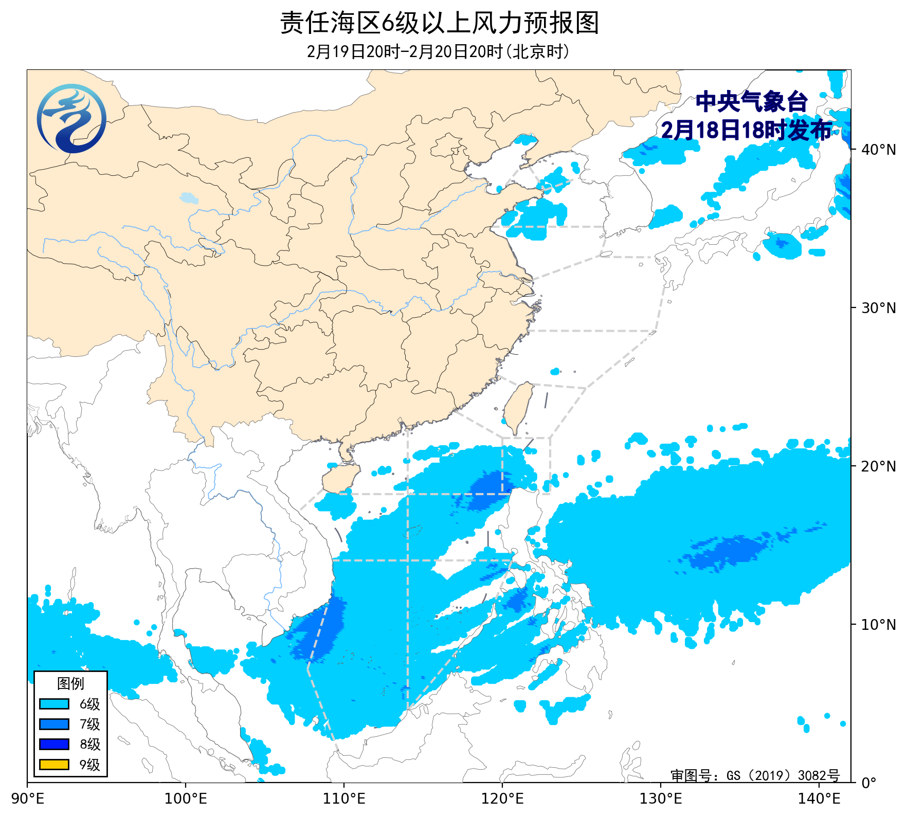 2月18日02時至14時,東海大部海域、台灣以東洋面出現了5~6級、陣風7級的偏北風或西北風,台灣海峽、巴士海峽、南海北部海域、北部灣、南海中西部和南部海域出現了5~7級、陣風8級的偏北風或東北風。