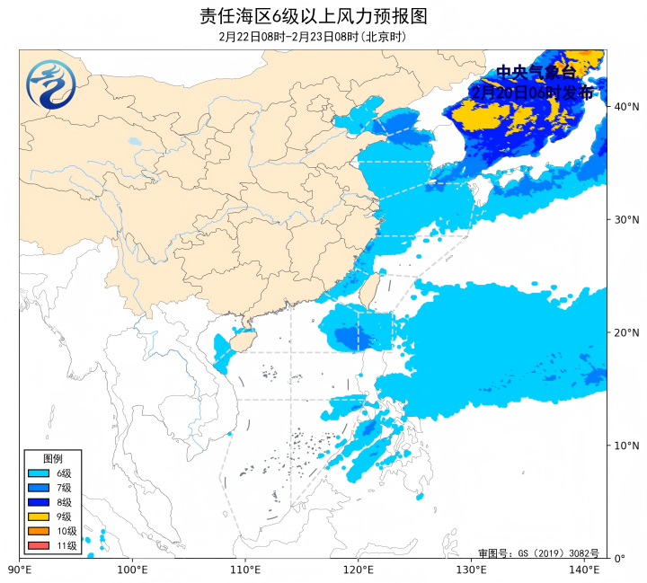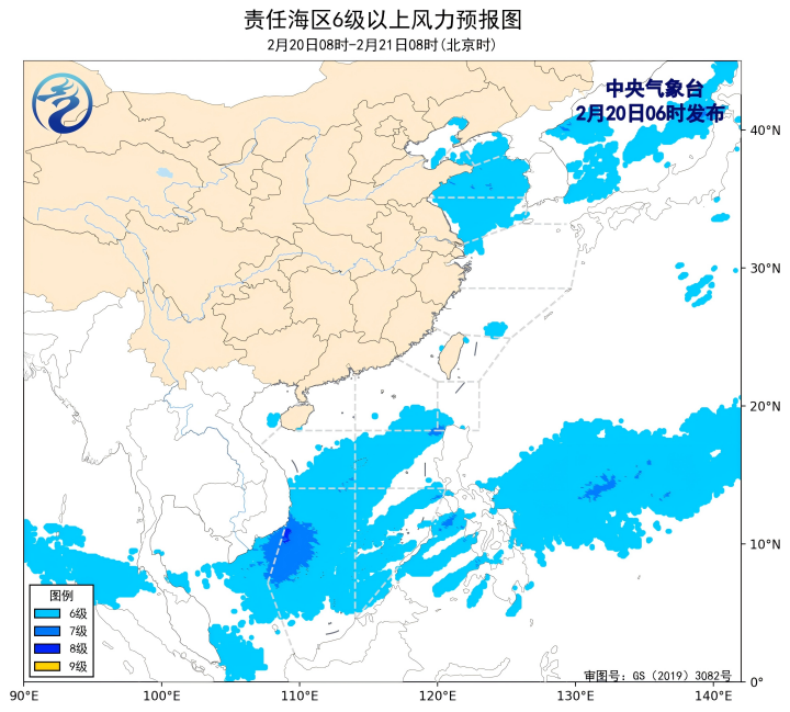 20日08時至21日08時,南海西南部海域將有6~7級、陣風8級的東北風,渤海海峽、黃海大部海域將有4~6級、陣風7級的偏南風,巴士海峽、南海東部和中西部海域將有4~6級、陣風7級的偏東到東北風。
