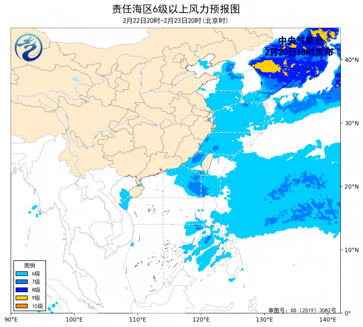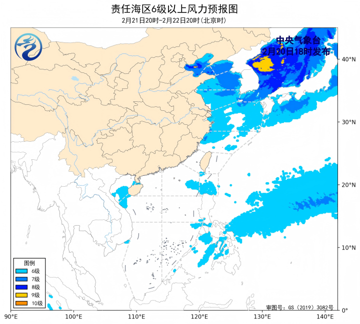2月20日02時至14時,渤海出現了5~6級、陣風7級的偏南風,東海南部海域、南海西南部海域出現了5~7級、陣風8級的偏北風,巴士海峽、南海東北部海域、南海中西部海域、南海東南部海域出現了5~6級、陣風7級的東北風或偏東風。黃海北部海域出現了能見度不足1公里的大霧。
