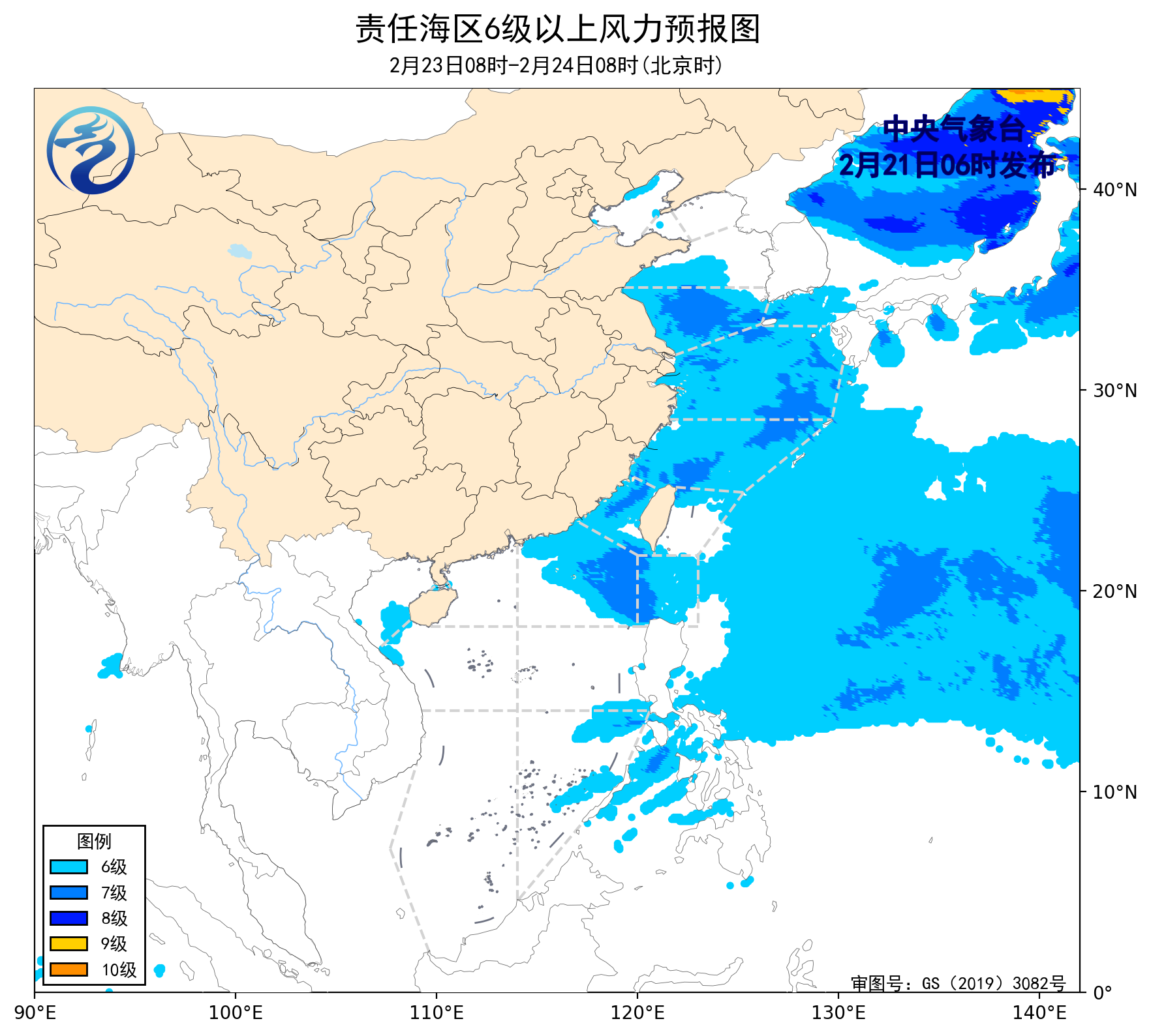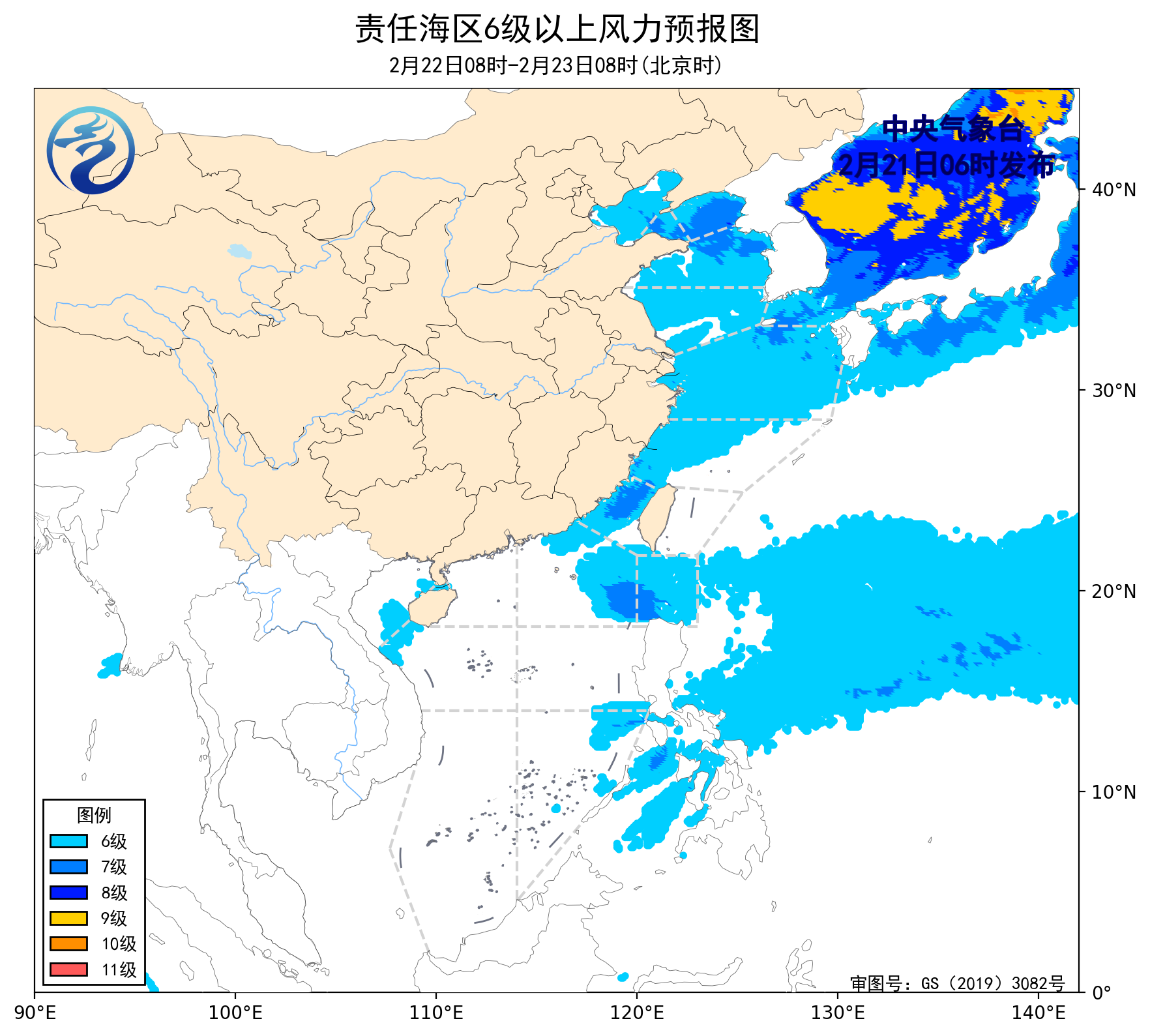 2月20日14時至21日02時,渤海、黃海中部和南部海域出現了5~6級、陣風7級的偏南風,巴士海峽、南海西南部海域出現了5~7級、陣風8級的東北風。黃海北部海域出現了能見度不足1公里的大霧。