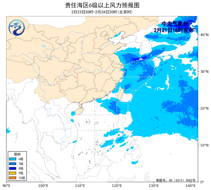 預計,2月24日夜間至28日白天,黃海南部海域、東海大部海域、台灣海峽、巴士海峽、台灣以東洋面、南海東北部海域將有6~7級、陣風8級的風。