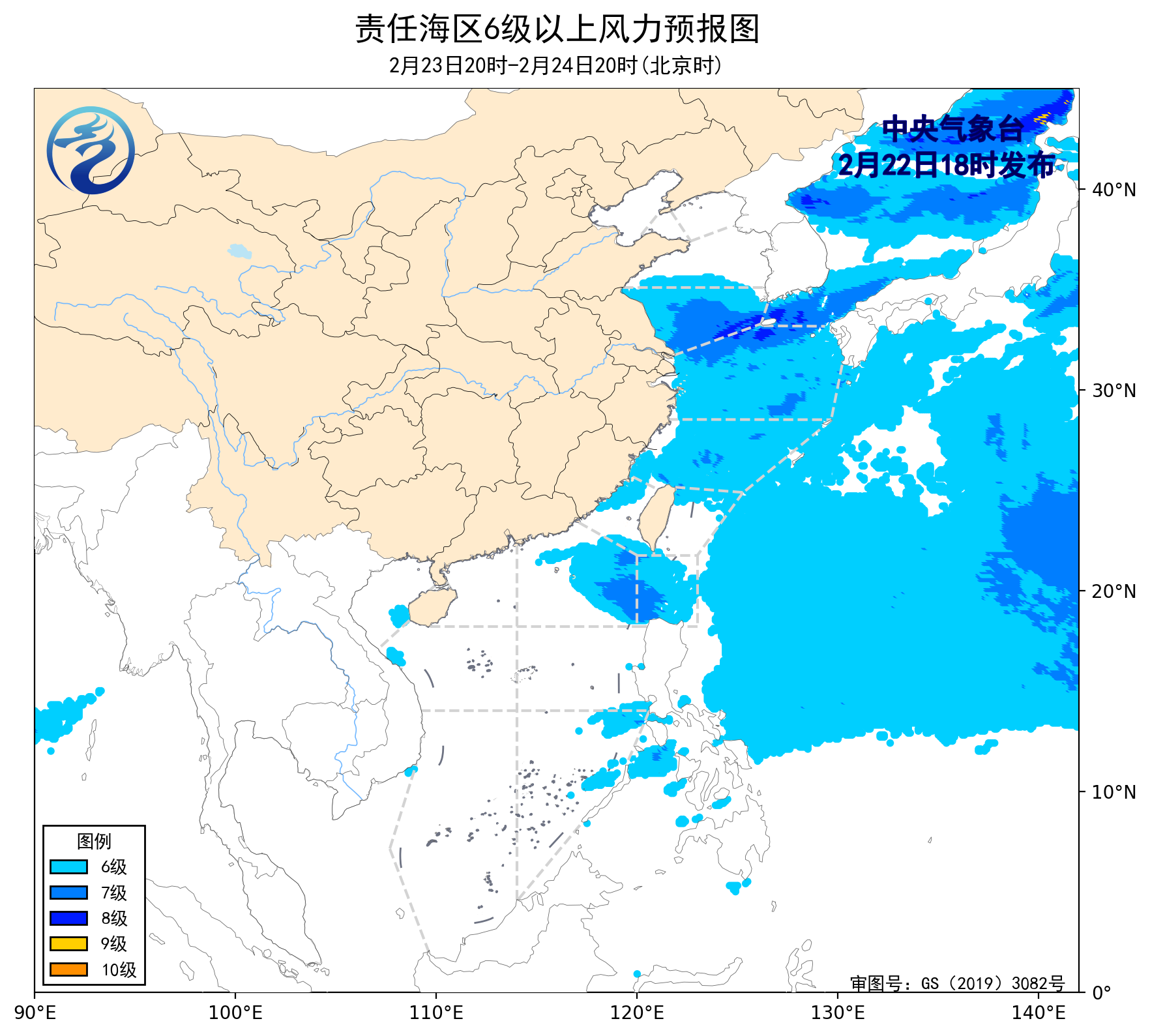 23日20時至24日20時,黃海南部海域將有5~7級、陣風8級的偏東到東北風,東海北部海域將有5~6級、陣風7級的偏東轉偏南風,東海南部海域將有5~6級、陣風7級的東南風到偏南風,台灣海峽將有5~6級、陣風7級的偏北風減弱到4級以下的偏東風,巴士海峽、南海東北部海域將有4~6級、陣風7級的偏東到東南風。