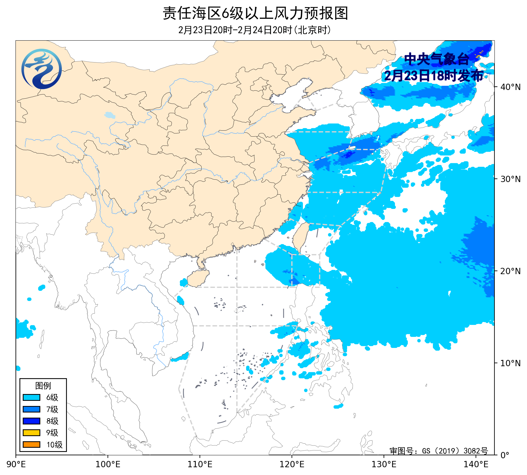 23日20時至24日20時,黃海南部海域、東海大部海域將有5~7級、陣風8級的東北風,其中東海東北部的部分海域風力可達8級、陣風9級,台灣海峽將有5~6級、陣風7級減弱到4級以下的東南風,巴士海峽、南海東北部海域將有4~6級、陣風7級的偏東到東南風。
