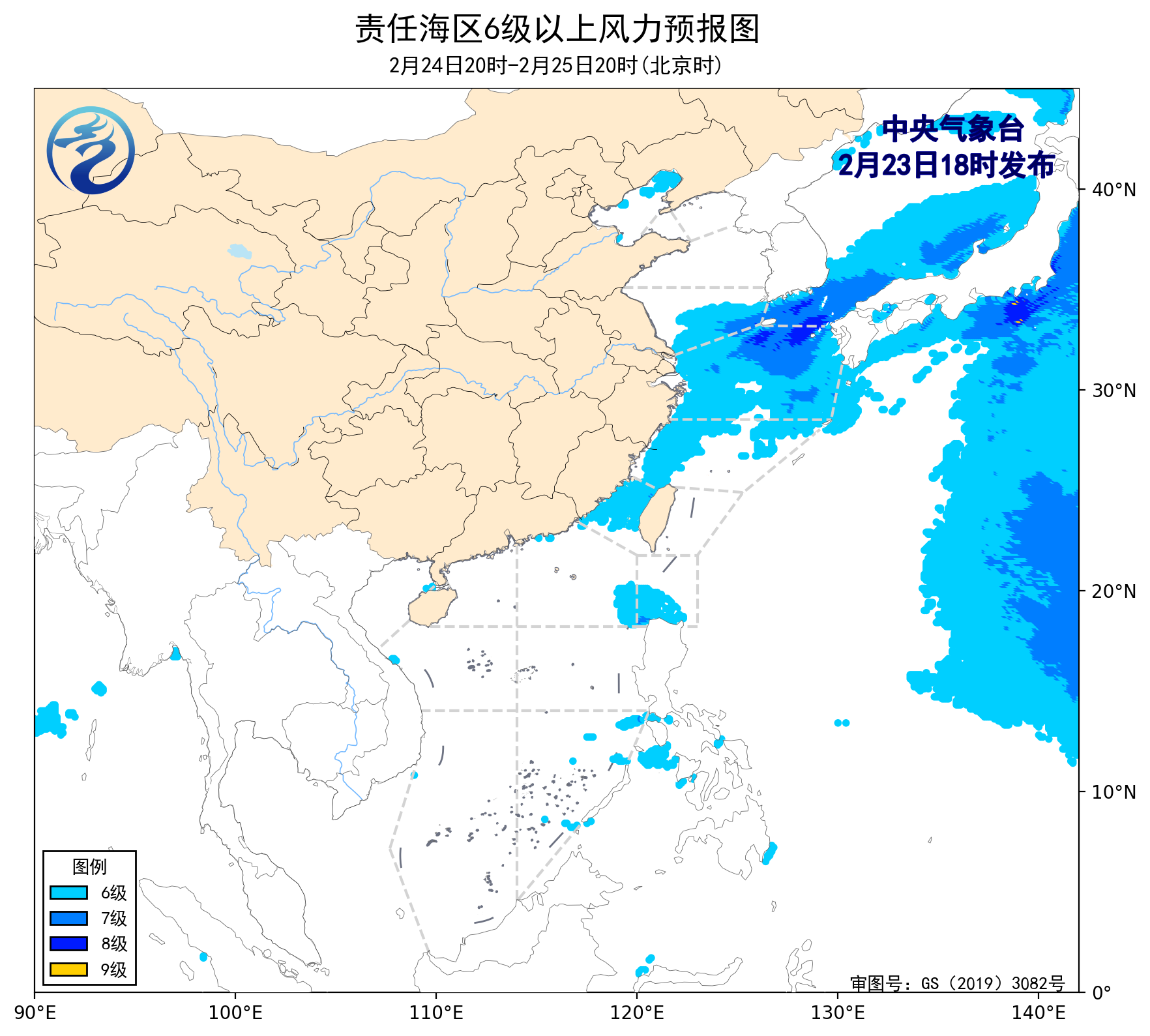 24日20時至25日20時,東海北部海域將有5~7級、陣風8級的東北風,其中部分海域風力可達8級、陣風9級,黃海南部海域、東海南部海域、台灣海峽將有4~6級、陣風7級的偏北到東北風,巴士海峽將有4~6級、陣風7級的偏東風。