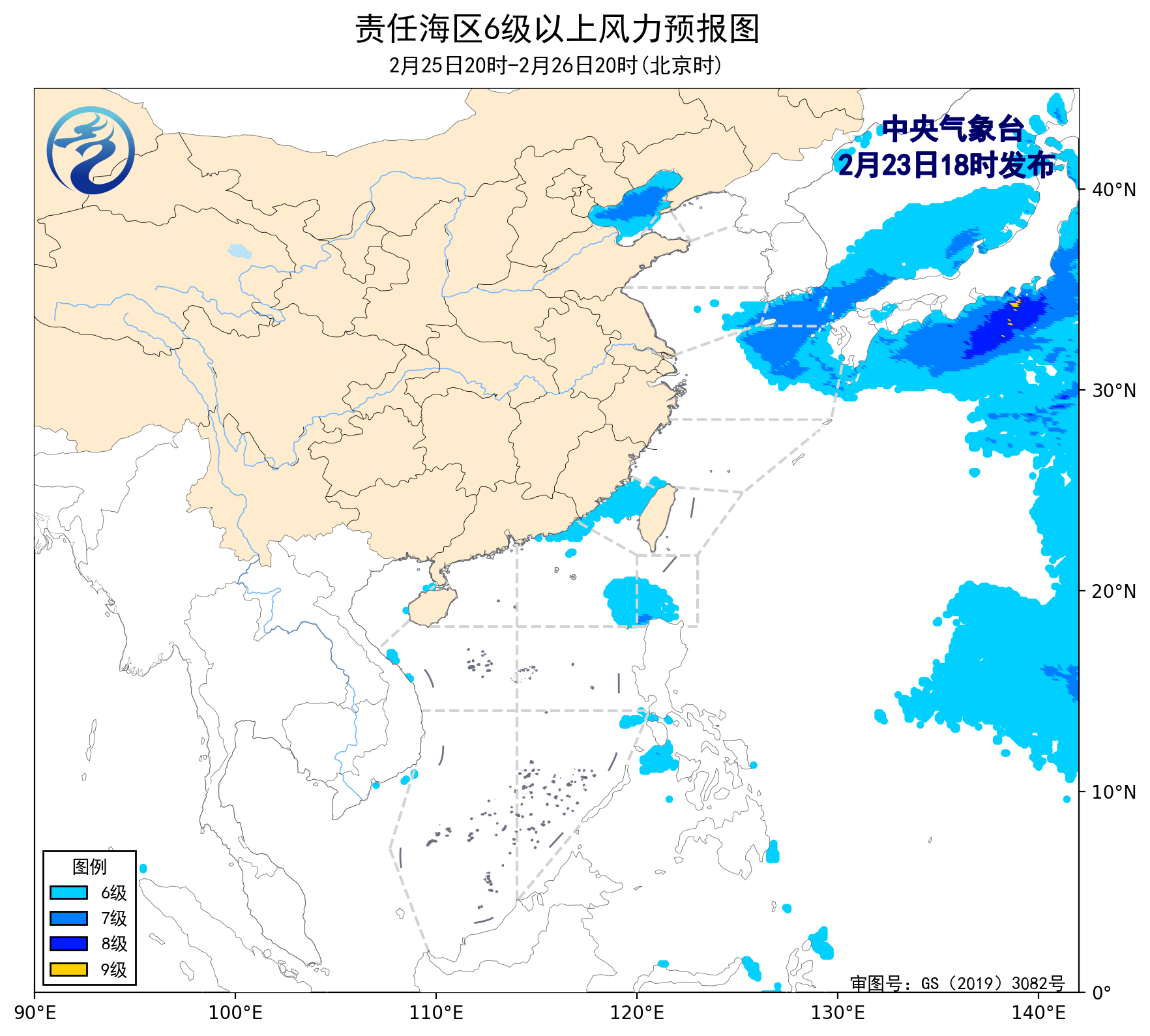 預計,2月27日夜間至3月1日白天,渤海、渤海海峽、黃海中部和南部海域、東海大部海域、台灣海峽、巴士海峽、南海東北部海域將有6~7級、陣風8級的風,其中東海北部的部分海域風力可達8級、陣風9級。3月1日夜間至2日白天,黃海南部海域、東海大部海域將有5~7級、陣風8級的風。