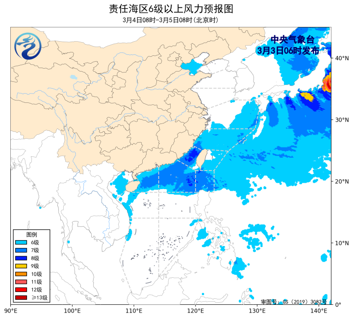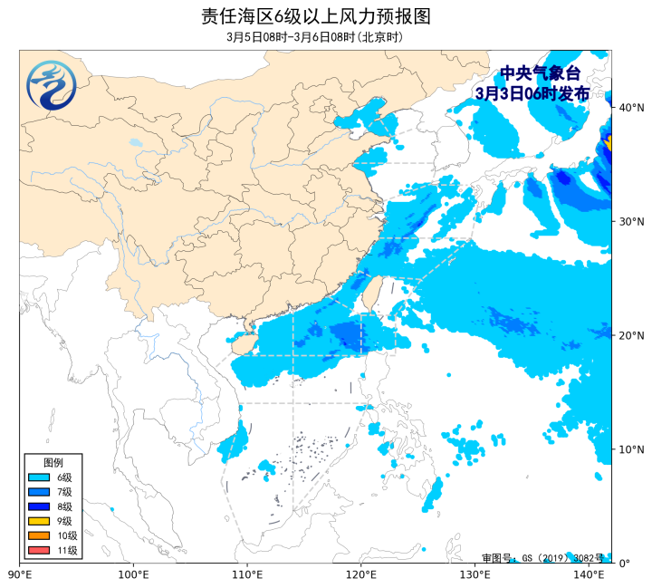3日08時至4日08時,渤海、黃海南部海域將有5~6級、陣風7級的風,東海大部海域、台灣海峽、台灣以東洋面、巴士海峽、南海北部海域、北部灣將有7~8級、陣風9~10級的大風。