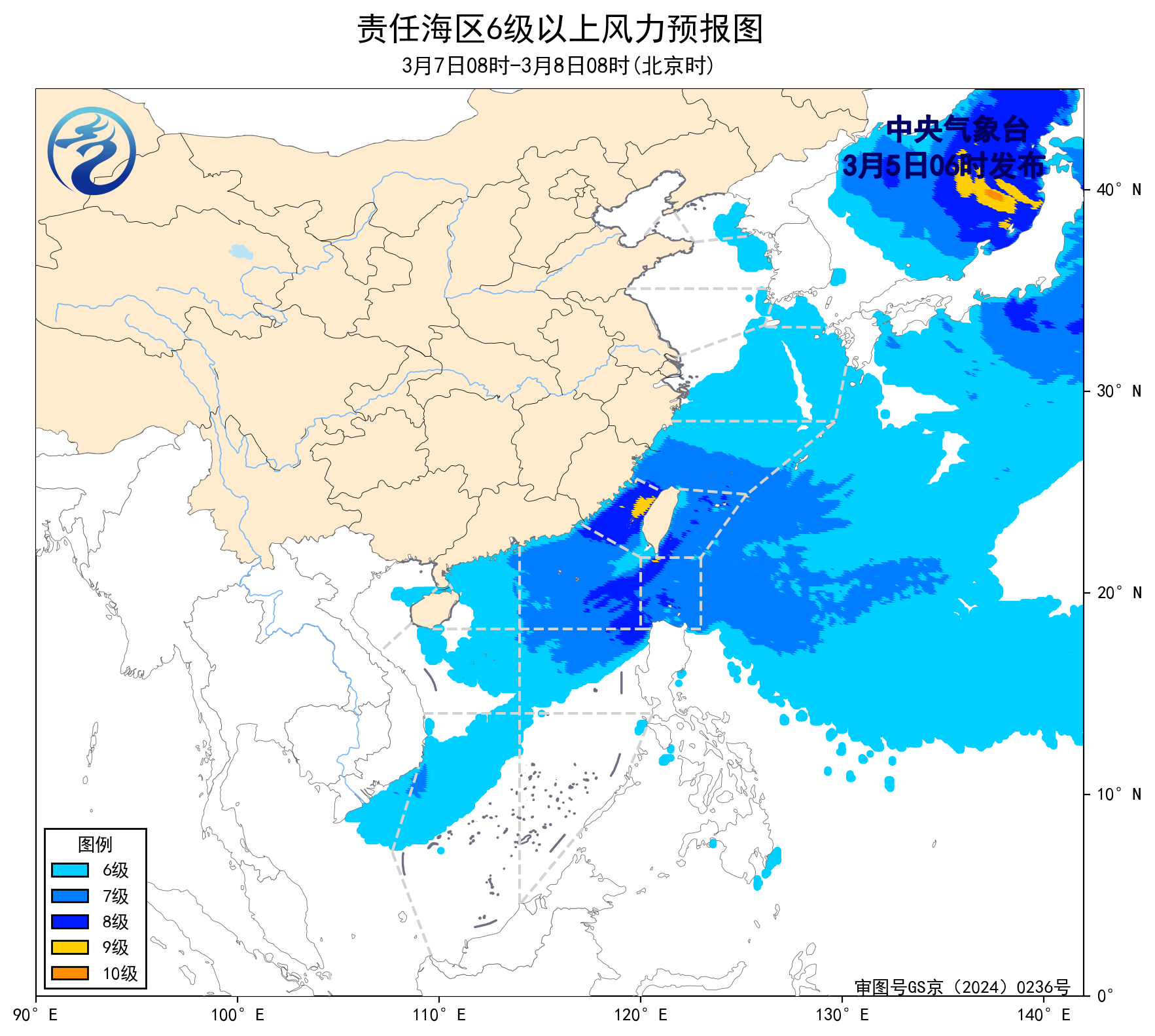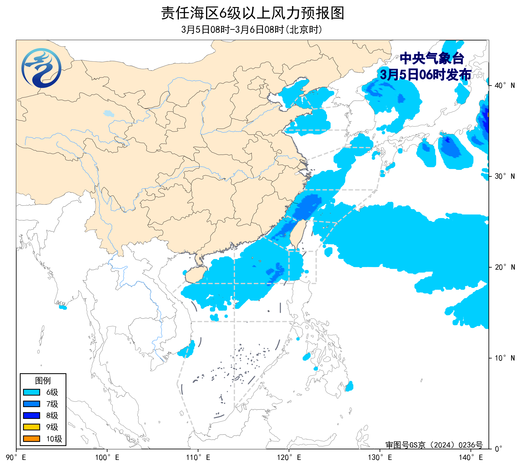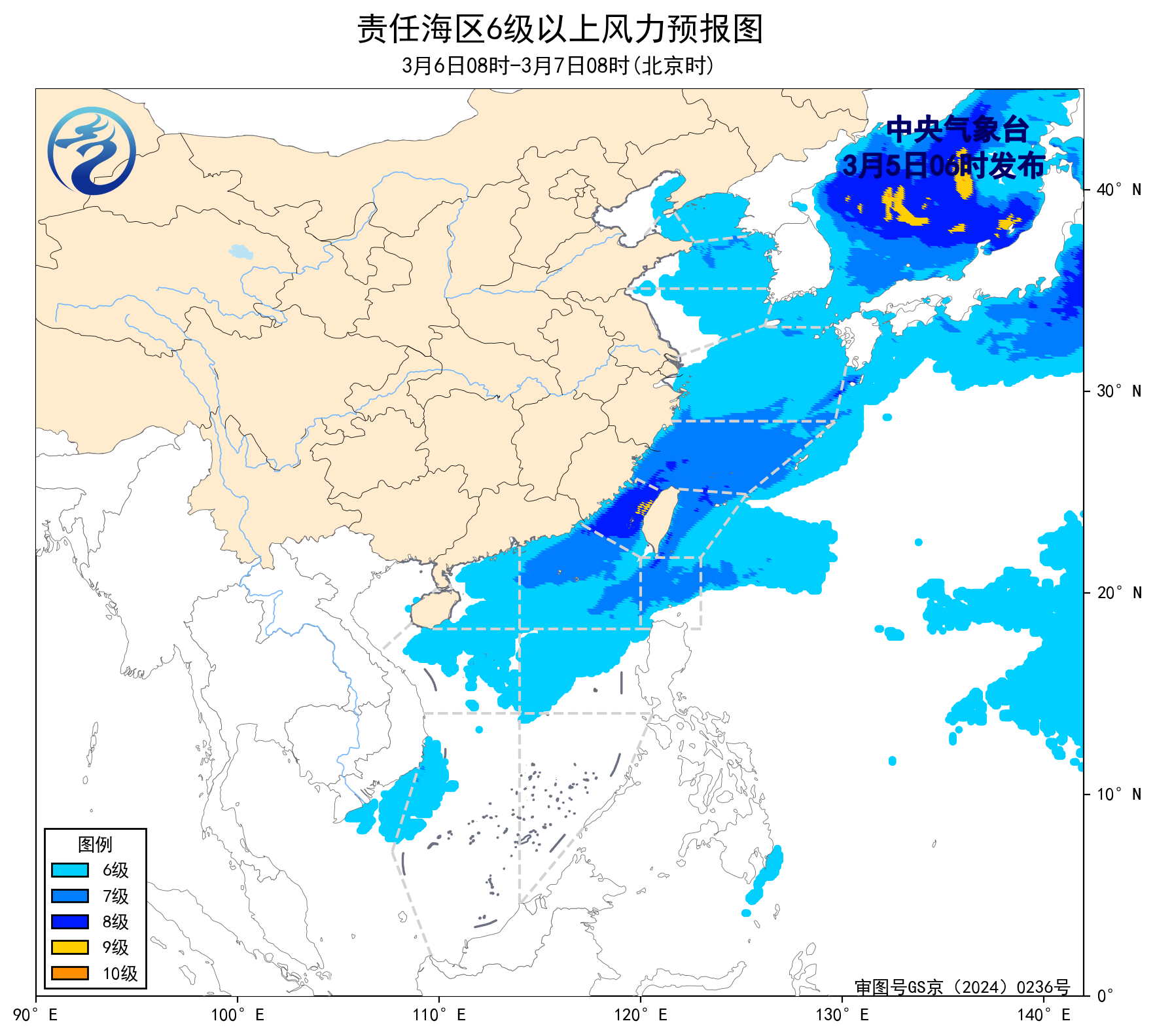 3月4日14時至5日02時,東海南部海域、巴士海峽、南海北部海域出現了5~6級、陣風7級的東北風或偏東風,台灣海峽出現了6~7級、陣風8級的偏北風。