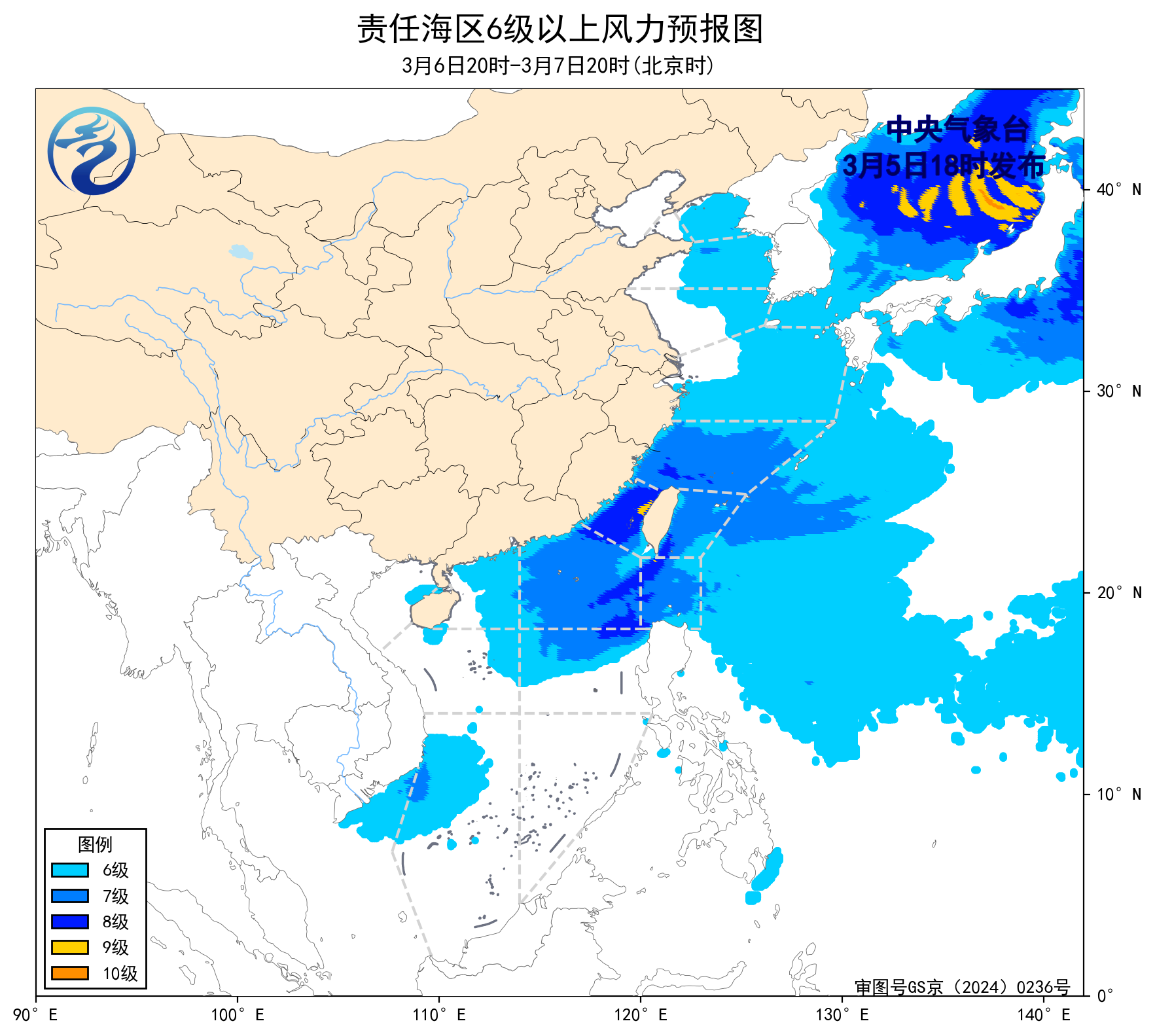 6日20時至7日20時,台灣海峽將有7~8級、陣風9級的東北風,其中台灣海峽部分海域風力可達9級、陣風10級,東海南部海域、台灣以東洋面、巴士海峽、南海東北部海域將有6~7級、陣風8級的東北風,南海中東部海域將有4~5級增大到6~7級、陣風8級的東北風,黃海大部海域、東海北部海域、南海西北部和西南部海域將有4~6級、陣風7級的偏北到東北風。