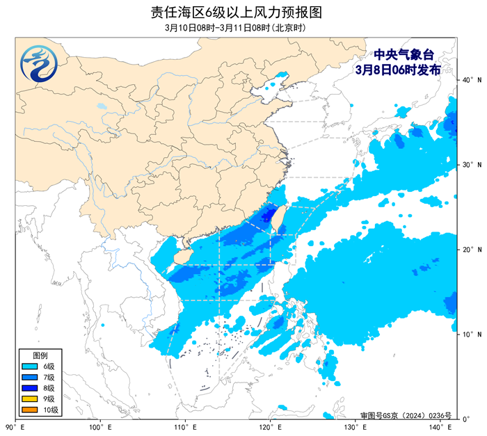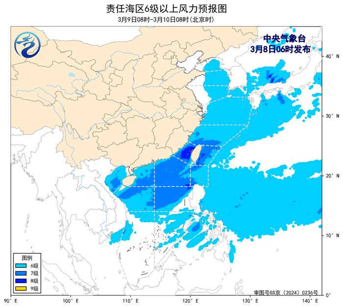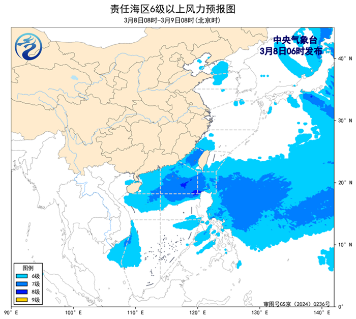 3月7日14時至8日02時,東海大部海域、南海西部海域出現了5~6級、陣風7級的偏北風或東北風,台灣海峽、台灣以東洋面、巴士海峽、南海東北部海域、南海中東部海域出現了6~8級、陣風9級的東北風。
