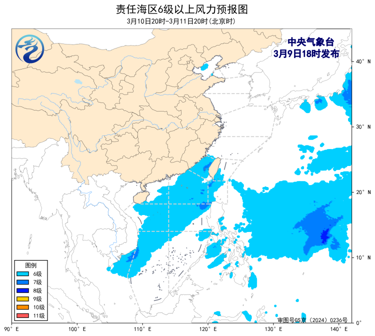 10日20時至11日20時,台灣海峽、巴士海峽、南海西部、東北部和南海中東部海域將有5~6級、陣風7級的東北風。