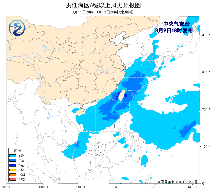 預計,3月12日夜間至16日白天,渤海、瓊州海峽將有5~6級、陣風7級的風,東海大部海域、台灣以東洋面、南海大部海域將有6~8級、陣風9級的大風,台灣海峽將有8~9級、陣風10級減弱至6~7級、陣風8級的風,巴士海峽將有7~8級、陣風9級的大風,北部灣將有6~7級、陣風8級的風。