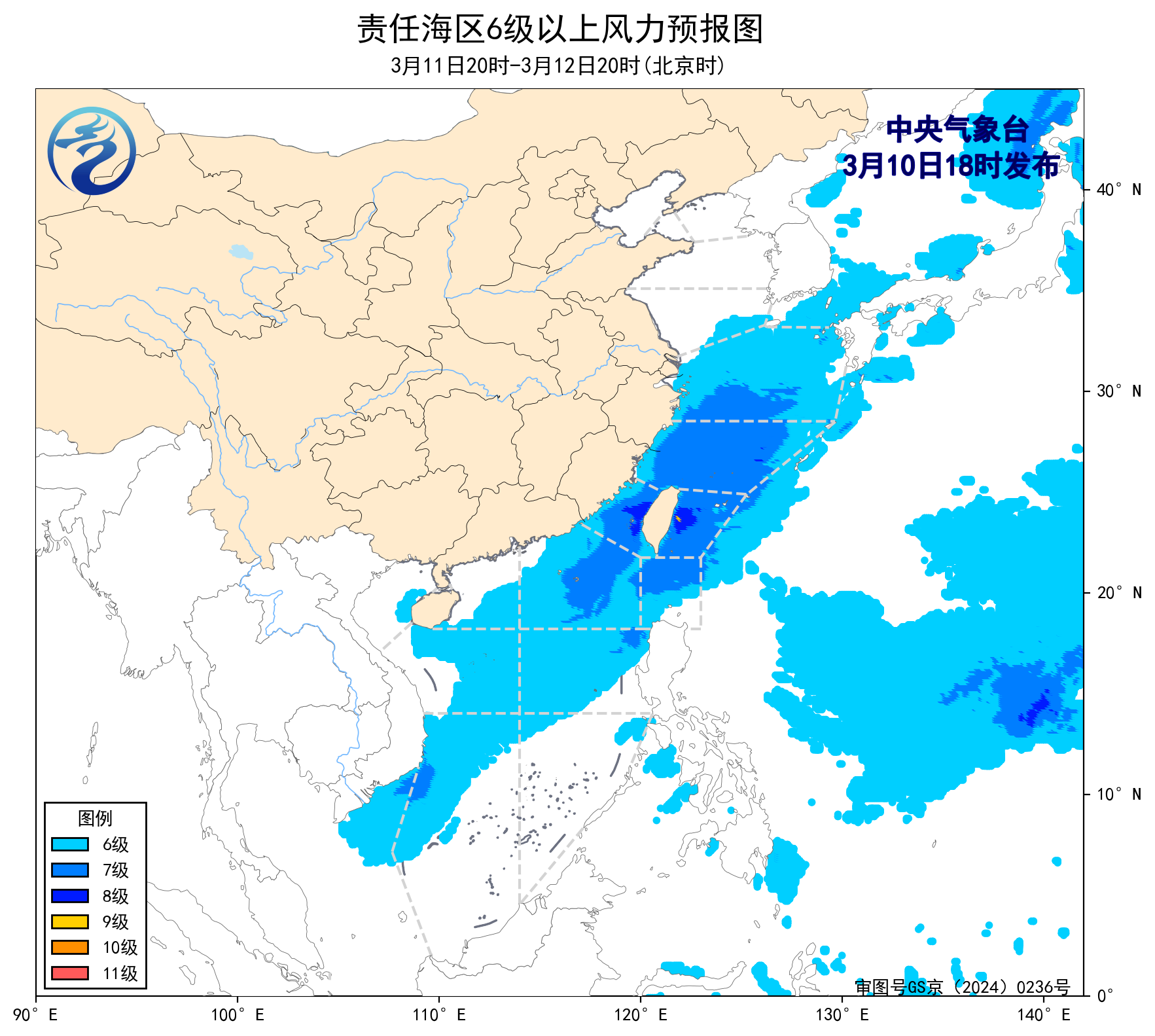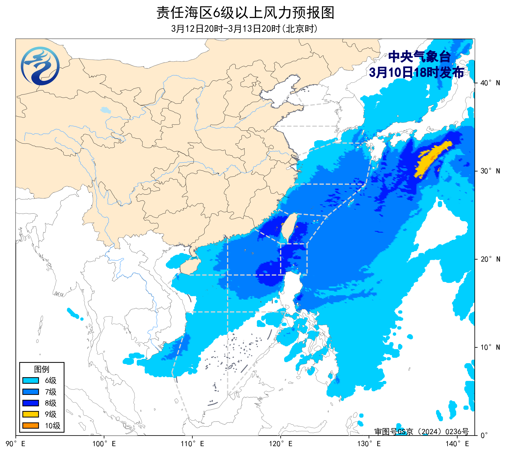 預計,3月13日夜間至17日白天,渤海、北部灣、瓊州海峽將有5~6級、陣風7級的風,東海大部海域、台灣海峽、台灣以東洋面、南海大部海域將有6~8級、陣風9級的大風,巴士海峽將有7~8級、陣風9級的大風。
