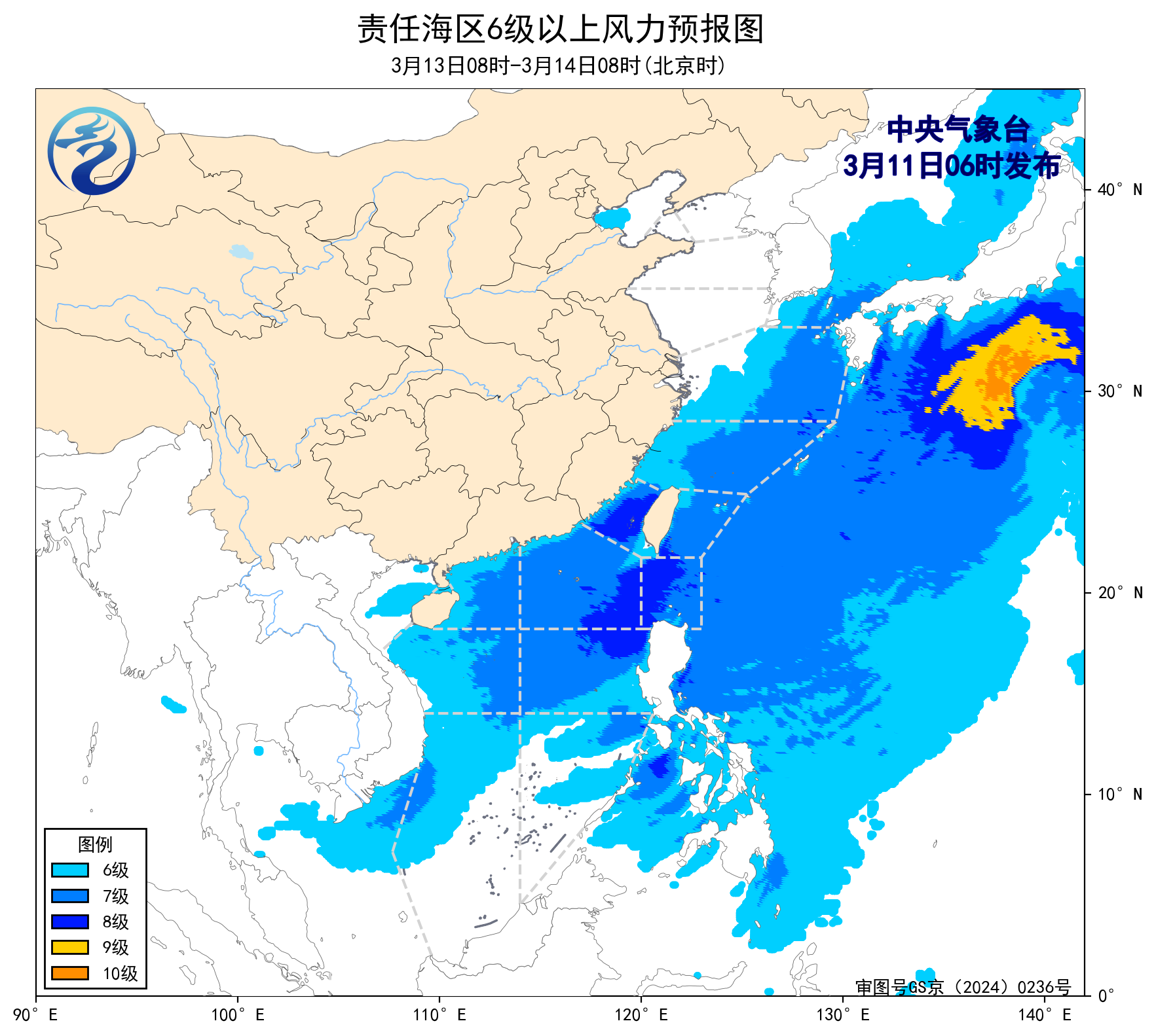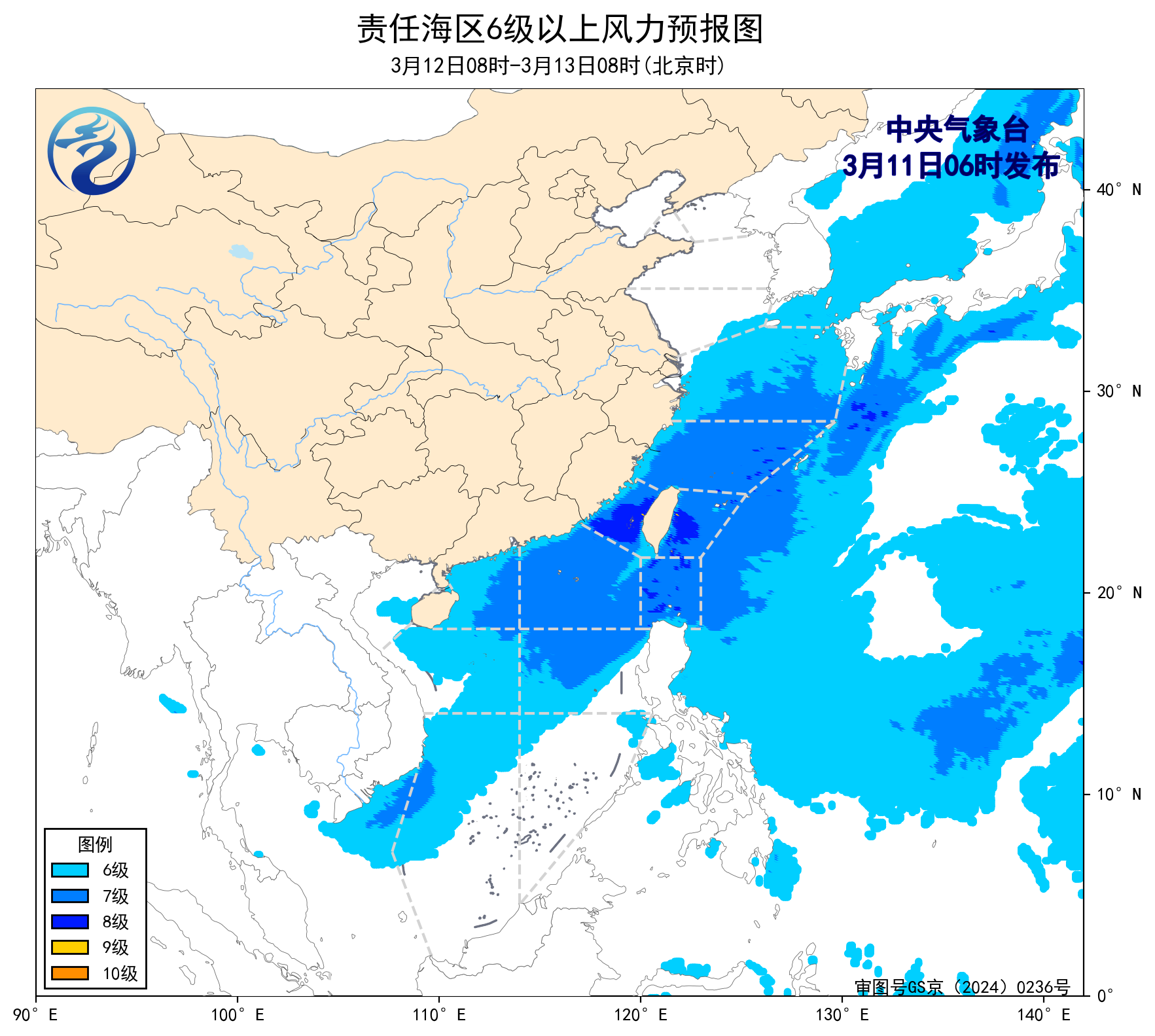 11日08時至12日08時,東海南部海域、台灣海峽、巴士海峽、南海東北部、中東部和南海西南部海域將有5~6級、陣風7級的偏北到東北風。