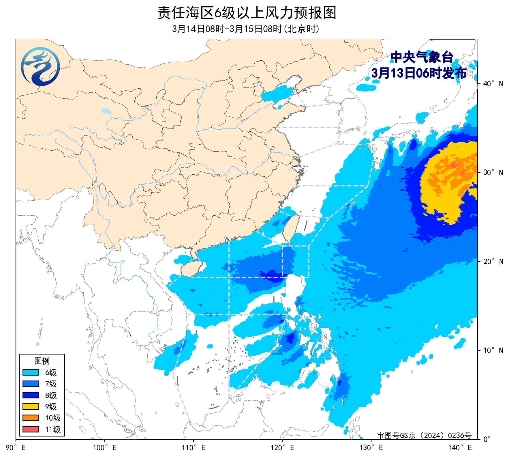 14日08時至15日08時,巴士海峽、南海東北部和中東部海域將有6~7級、陣風8級的偏東到東北風,渤海、東海大部海域、台灣海峽、台灣以東洋面、瓊州海峽、南海西北部、中西部和南海東南部海域將有5~6級、陣風7級的偏東到東北風。