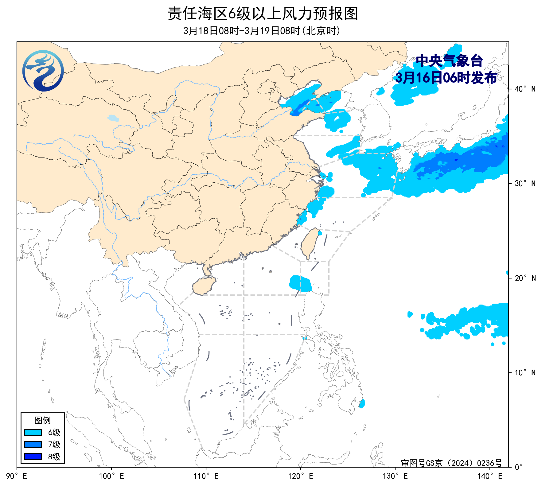 16日08時至17日08時,巴士海峽、南海東北部海域將有5~6級、陣風7級的偏東風。